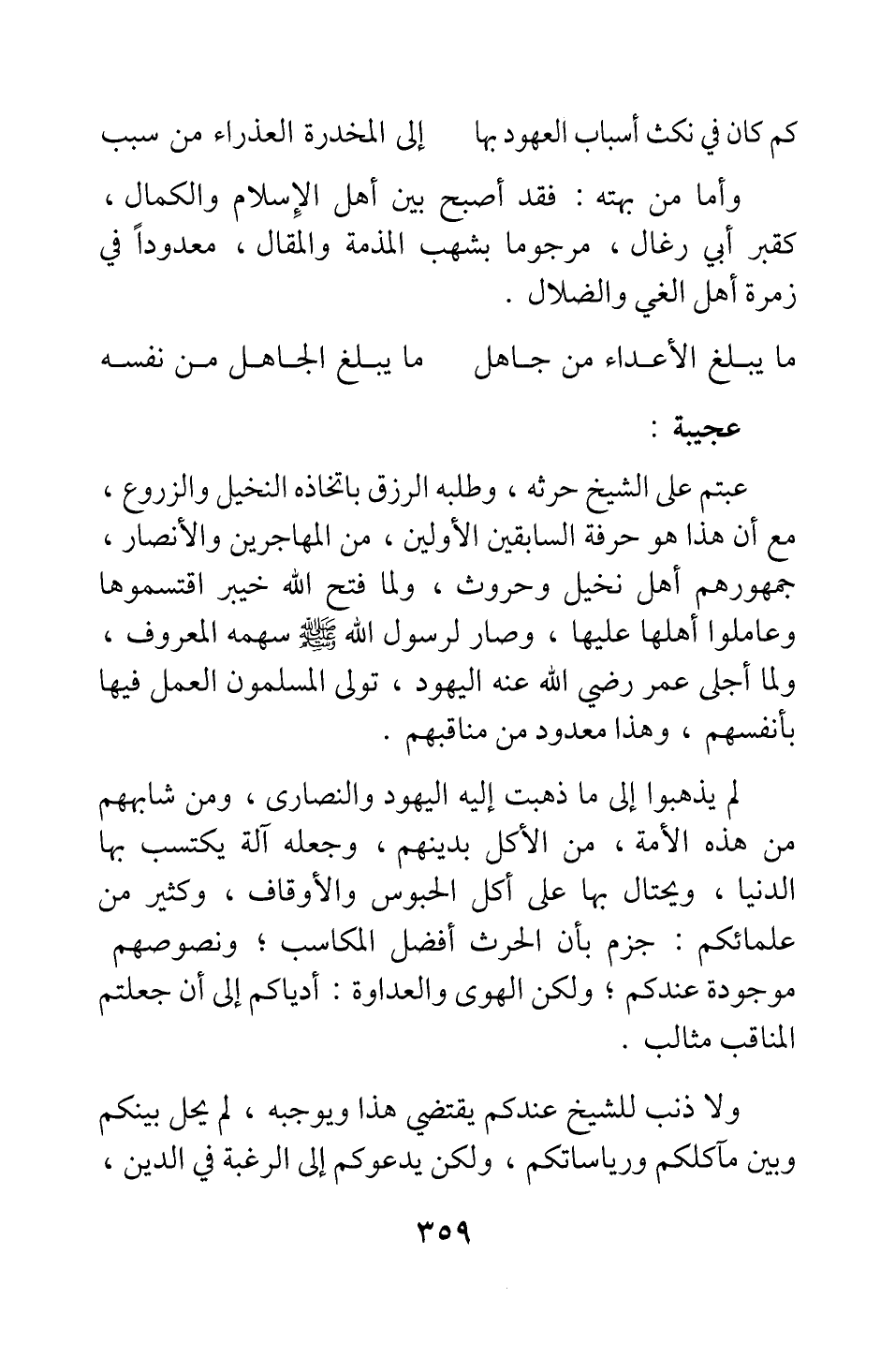 عبتم على الشيخ حرثه، وطلبه الرزق باتخاذه النخيل والزروع، مع أن هذا هو حرفة السابقين الأولين من المهاجرين والأنصار، جمهورهم أهل نخيل وحروث؛ ولما فتح الله خيبر اقتسموها وعاملوا أهلها عليها، وصار لرسول الله صلى الله عليه وسلم سهمه المعروف. ولما أجلى عمر رضي الله عنه اليهود، تولى المسلمون العمل فيها بأنفسهم، وهذا معدود من مناقبهم.