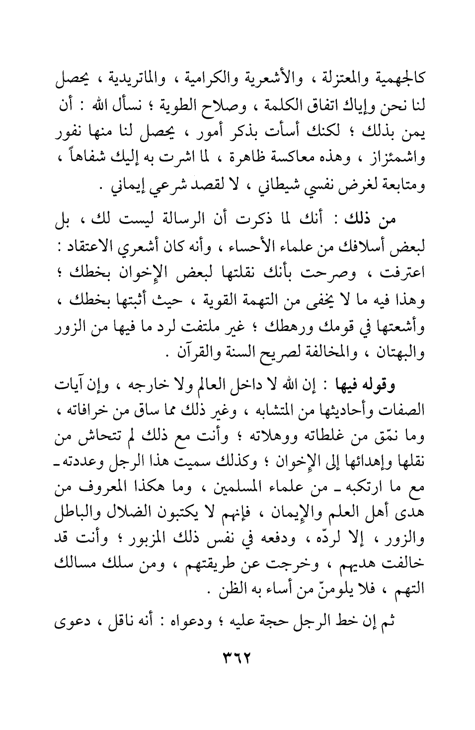 من ذلك: أنك لما ذكرت أن الرسالة ليست لك، بل لبعض أسلافك من علماء الأحساء، وأنه كان أشعري الاعتقاد، اعترفت، وصرحت بأنك نقلتها لبعض الإخوان بخطك; وهذا فيه ما لا يخفى من التهمة القوية، حيث أثبتها بخطك، وأشعتها في قومك ورهطك، غير ملتفت لرد ما فيها من الزور والبهتان، والمخالفة لصريح السنة والقرآن.