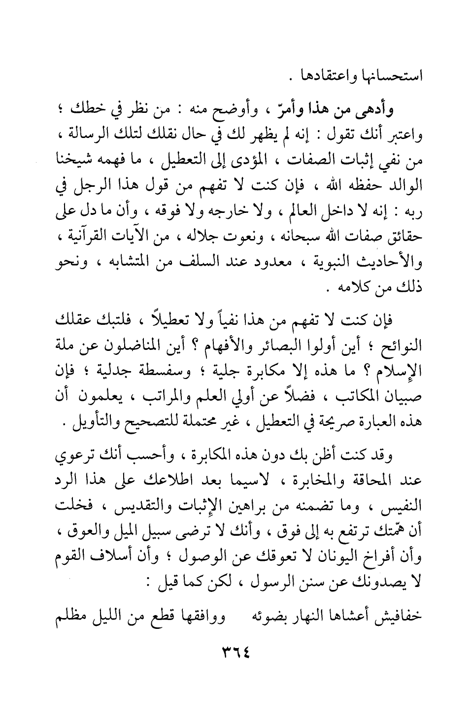 وأدهى من هذا وأمر، وأوضح منه: من نظر في خطك، واعتبر أنك تقول: إنه لم يظهر لك في حال نقلك لتلك الرسالة، من نفي إثبات الصفات، المؤدي إلى التعطيل، ما فهمه شيخنا الوالد حفظه الله، فإن كنت لا تفهم من قول هذا الرجل في ربه: إنه لا داخل العالم، ولا خارجه ولا فوقه، وأن ما دل على حقائق صفات الله سبحانه، ونعوت جلاله، من الآيات القرآنية، والأحاديث النبوية، معدود عند السلف من المتشابه، ونحو ذلك من كلامه.