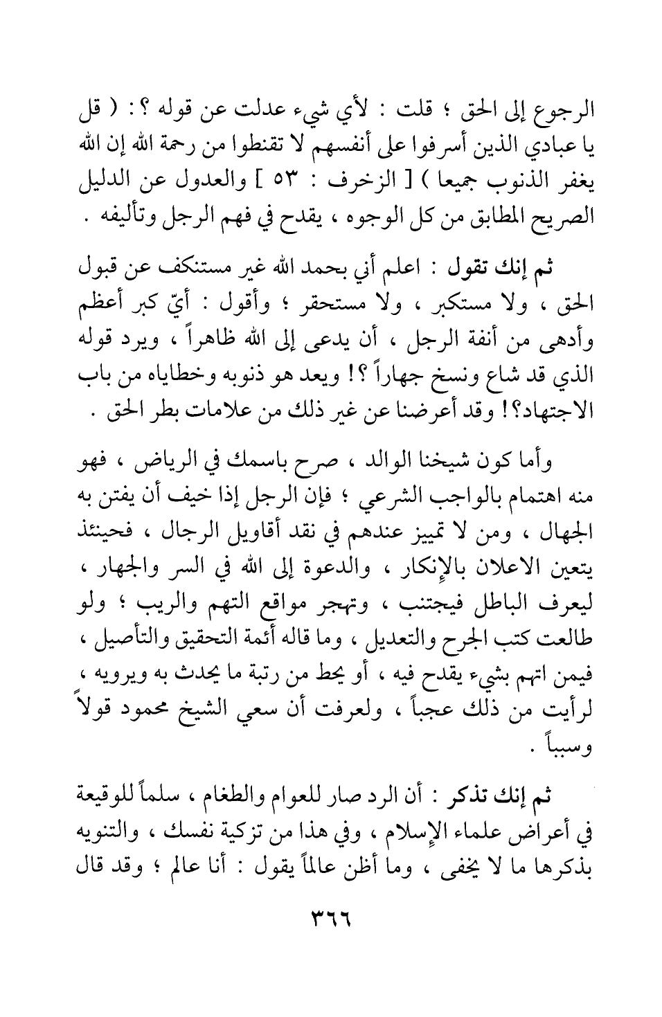 وأما كون شيخنا الوالد صرح باسمك في الرياض، فهو منه اهتمام بالواجب الشرعي، فإن الرجل إذا خيف أن يفتن به الجهال، ومن لا تمييز عندهم في نقد أقاويل الرجال، فحينئذ يتعين الإعلان بالإنكار، والدعوة إلى الله في السر والجهار، ليعرف الباطل فيجتنب، وتهجر مواقع التهم والريب ; ولو طالعت كتب الجرح والتعديل، وما قاله أئمة التحقيق والتأصيل، فيمن اتهم بشيء يقدح فيه، أو يحط من رتبة ما يحدث به ويرويه، لرأيت من ذلك عجبا، ولعرفت أن سعي الشيخ محمود قولا وسببا.