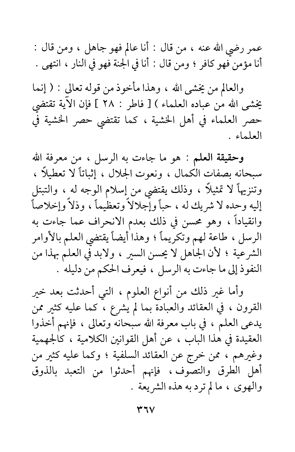 وأما غير ذلك من أنواع العلوم، التي أحدثت بعد خير القرون، في العقائد والعبادة بما لم يشرع، كما عليه كثير ممن يدعي العلم، في باب معرفة الله سبحانه وتعالى، فإنهم أخذوا العقيدة في هذا الباب، عن أهل القوانين الكلامية، كالجهمية وغيرهم، ممن خرج عن العقائد السلفية، وكما عليه كثير من أهل الطرق والتصوف، فإنهم أحدثوا من التعبد بالذوق والهوى، ما لم ترد به هذه الشريعة.