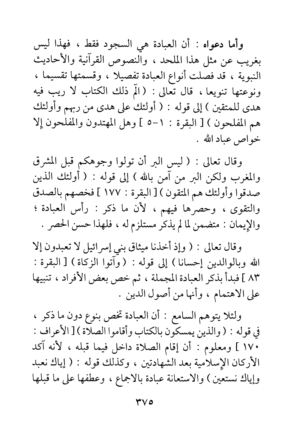 وأما دعواه أن العبادة هي السجود فقط، فهذا ليس بغريب عن مثل هذا الملحد؛ والنصوص القرآنية والأحاديث النبوية، قد فصلت أنواع العبادة تفصيلا، وقسمتها تقسيما، ونوعتها تنويعا، قال تعالى: {الم ذَلِكَ الْكِتَابُ لا رَيْبَ فِيهِ هُدىً لِلْمُتَّقِينَ} [سورة البقرة آية: 1-2] إلى قوله: {أُولَئِكَ عَلَى هُدىً مِنْ رَبِّهِمْ وَأُولَئِكَ هُمُ الْمُفْلِحُونَ} [سورة البقرة آية: 5] ؛ وهل المهتدون والمفلحون إلا خواص عباد الله.