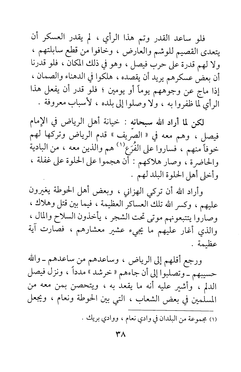 فلو ساعد القدر وتم هذا الرأي، لم يقدر العسكر أن يتعدى القصيم للوشم والعارض، وخافوا من قطع سابلتهم، ولا لهم قدرة على حرب فيصل، وهو في ذلك المكان. فلو قدرنا أن بعض عسكرهم يريد أن يقصده، هلكوا في الدهناء والصمان، إذا ماج عن وجوههم يوما أو يومين; فلو قدر أن يفعل هذا الرأي لما ظفروا به، ولا وصلوا إلى بلده، لأسباب معروفة.
