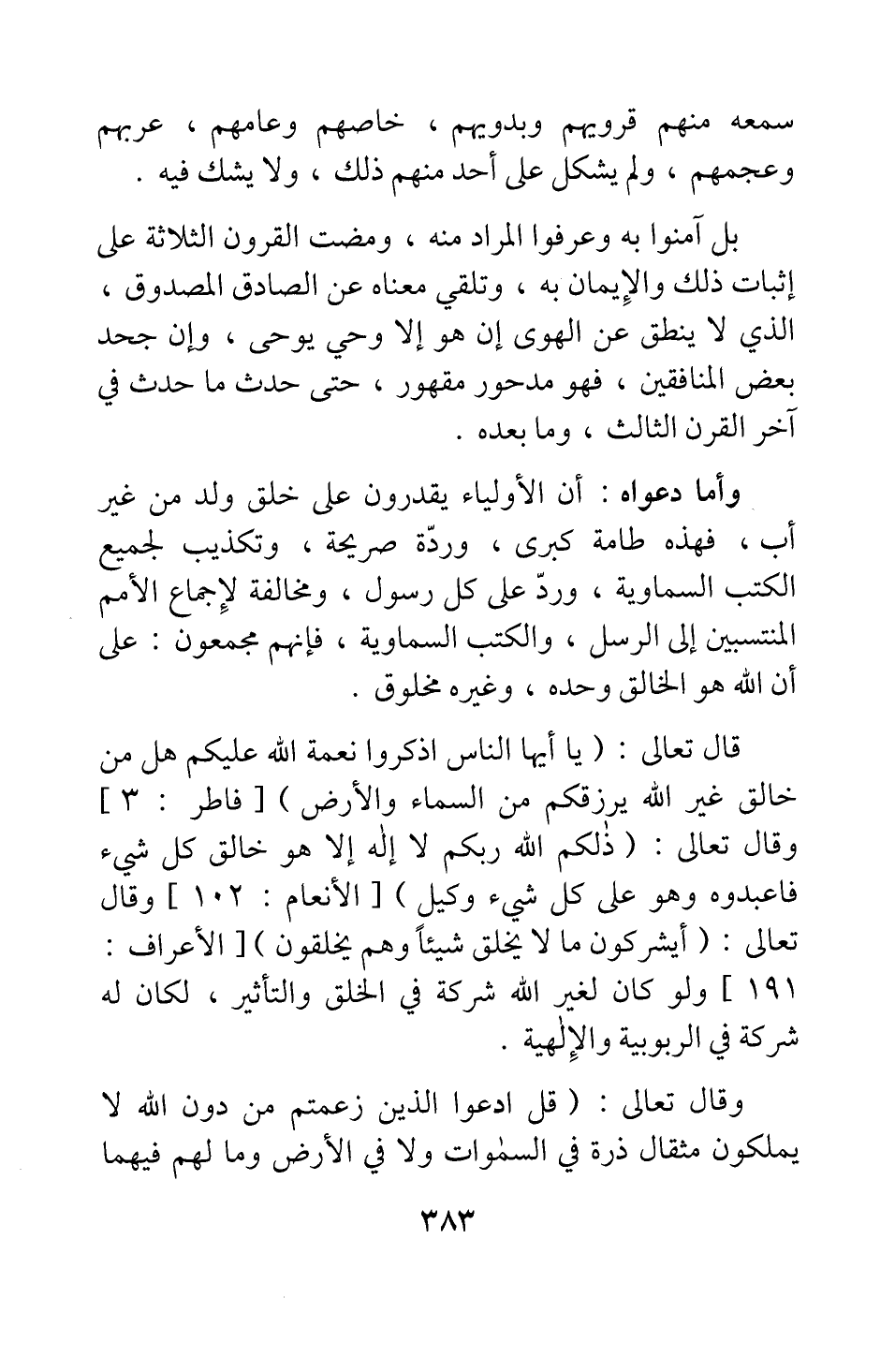 بل آمنوا به وعرفوا المراد منه، ومضت القرون الثلاثة على إثبات ذلك والإيمان به، وتلقي معناه عن الصادق المصدوق، الذي لا ينطق عن الهوى إن هو إلا وحي يوحى، وإن جحد بعض المنافقين، فهو مدحور مقهور، حتى حدث ما حدث في آخر القرن الثالث وما بعده.