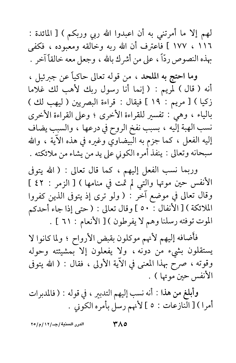 وما احتج به الملحد، من قوله تعالى حاكيا عن جبرئيل، أنه (قال) لمريم: {إِنَّمَا أَنَا رَسُولُ رَبِّكِ لِأَهَبَ لَكِ غُلاماً زَكِيّاً} [سورة مريم آية: 19] ، فيقال: قراءة البصريين (ليهب لك) بالياء، وهي: تفسير للقراءة الأخرى، وعلى القراءة الأخرى نسب الهبة إليه، بسبب نفخ الروح في درعها؛ والسبب يضاف إليه الفعل، كما جزم به البيضاوي وغيره في هذه الآية، والله سبحانه وتعالى: ينفذ أمره الكوني على يد من يشاء من ملائكته.