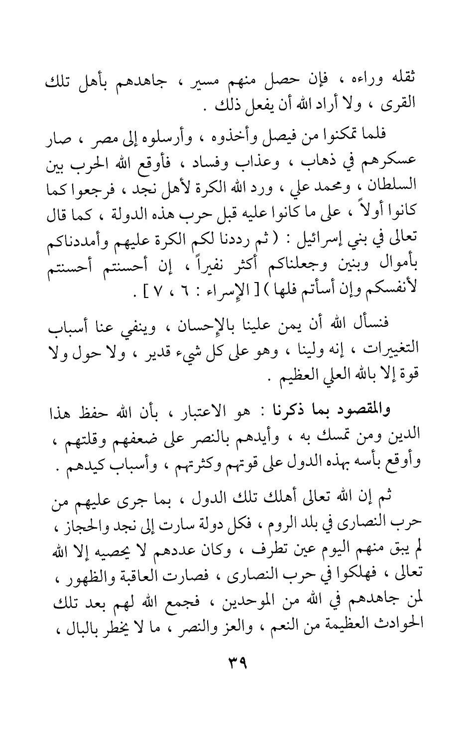 فلما تمكنوا من فيصل وأخذوه، وأرسلوه إلى مصر، صار عسكرهم في ذهاب، وعذاب وفساد؛ فأوقع الله الحرب بين السلطان، ومحمد علي، ورد الله الكرة لأهل نجد، فرجعوا كما كانوا أولا، على ما كانوا عليه قبل حرب هذه الدولة، كما قال تعالى في بني إسرائيل: {ثُمَّ رَدَدْنَا لَكُمُ الْكَرَّةَ عَلَيْهِمْ وَأَمْدَدْنَاكُمْ بِأَمْوَالٍ وَبَنِينَ وَجَعَلْنَاكُمْ أَكْثَرَ نَفِيراً إِنْ أَحْسَنْتُمْ أَحْسَنْتُمْ لأَنْفُسِكُمْ وَإِنْ أَسَأْتُمْ فَلَهَا} [سورة الإسراء آية: 6-7] .
