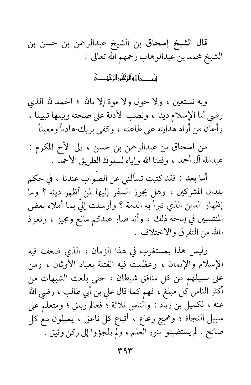 من إسحاق بن عبد الرحمن بن حسن، إلى الأخ المكرم: عبد الله آل أحمد، وفقنا الله وإياه لسلوك الطريق الأحمد.