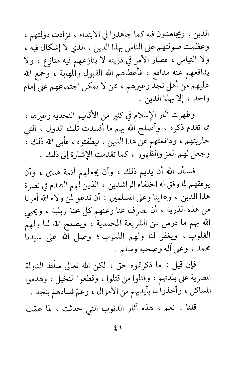 فنسأل الله أن يديم ذلك، وأن يجعلهم أئمة هدى، وأن يوفقهم لما وفق له الخلفاء الراشدين، الذين لهم التقدم في نصرة هذا الدين؛ وعلينا وعلى المسلمين أن ندعو لمن ولاه الله أمرنا من هذه الذرية، أن يصرف عنا وعنهم كل محنة وبلية، ويحيي الله بهم ما درس من الشريعة المحمدية، ويصلح الله لنا ولهم القلوب، ويغفر لنا ولهم الذنوب، وصلى الله على سيدنا محمد، وعلى آله وصحبه وسلم.