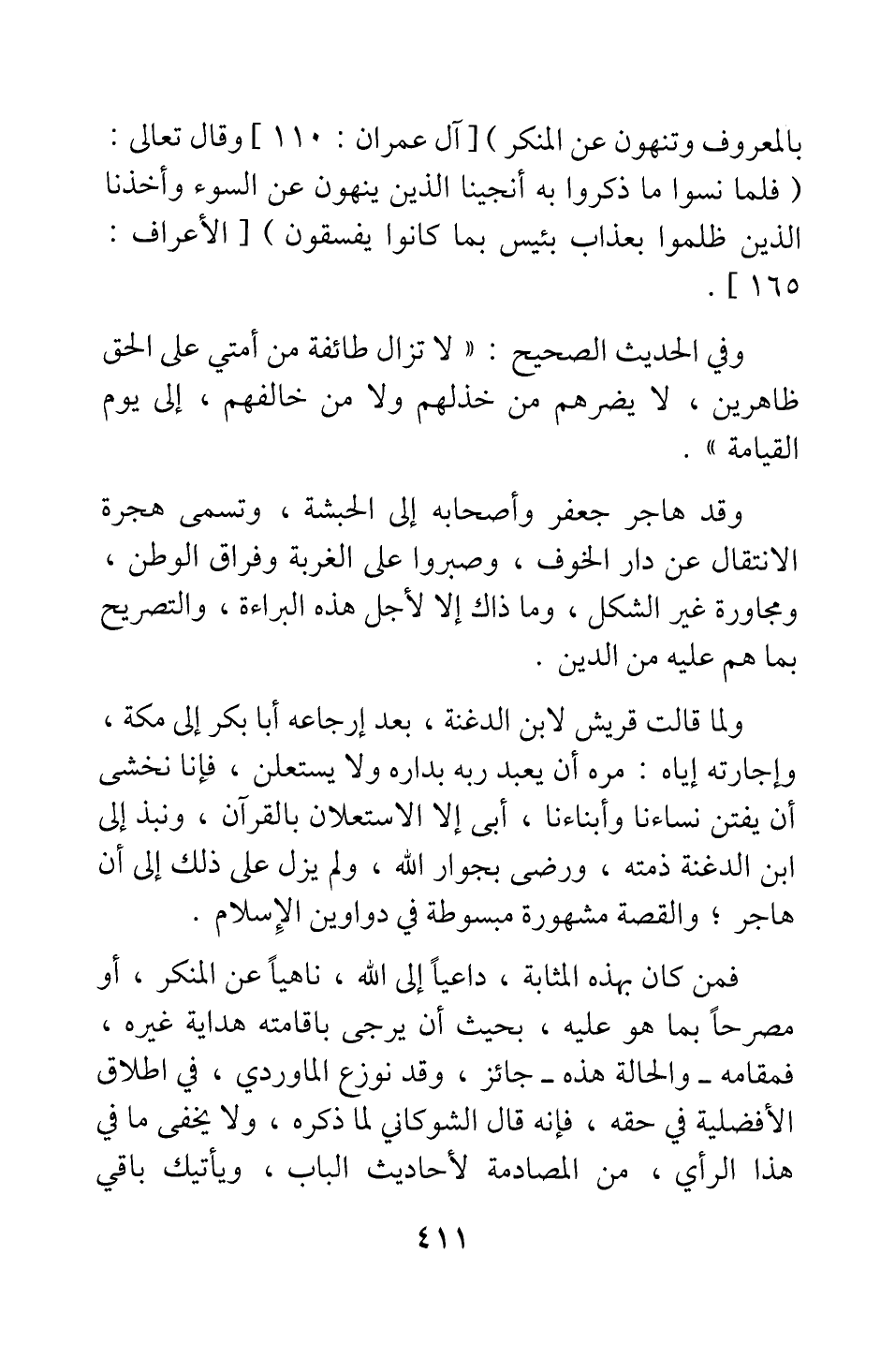 وقد هاجر جعفر وأصحابه إلى الحبشة؛ وتسمى هجرة الانتقال عن دار الخوف، وصبروا على الغربة وفراق الوطن، ومجاورة غير الشكل، وما ذاك إلا لأجل هذه البراءة، والتصريح بما هم عليه من الدين.