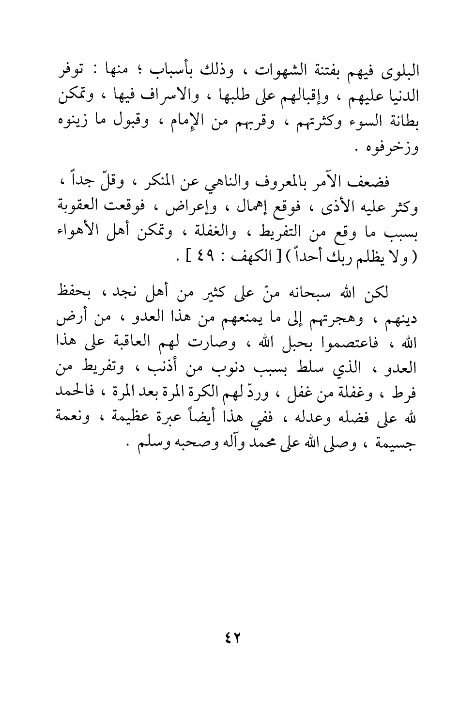 لكن الله سبحانه منّ على كثير من أهل نجد، بحفظ دينهم، وهجرتهم إلى ما يمنعهم من هذا العدو، من أرض الله، فاعتصموا بحبل الله، وصارت لهم العاقبة على هذا العدو، الذي سلط بسبب ذنوب من أذنب، وتفريط من فرط، وغفلة من غفل، ورد لهم الكرة المرة بعد المرة، فالحمد لله على فضله وعدله؛ ففي هذا أيضا عبرة عظيمة، ونعمة جسيمة، وصلى الله على محمد وآله وصحبه وسلم.