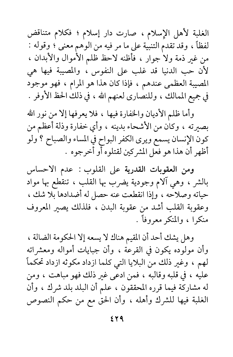 وأما ظلم الأديان والخفارة فيها، فلا يعرفها إلا من نور الله بصيرته، وكان من الأشحاء بدينه؛ وأي خفارة وذلة أعظم من كون الإنسان يسمع ويرى الكفر البواح في المساء والصباح؟ ولو أظهر أن هذا هو فعل المشركين لقتلوه أو أخرجوه.