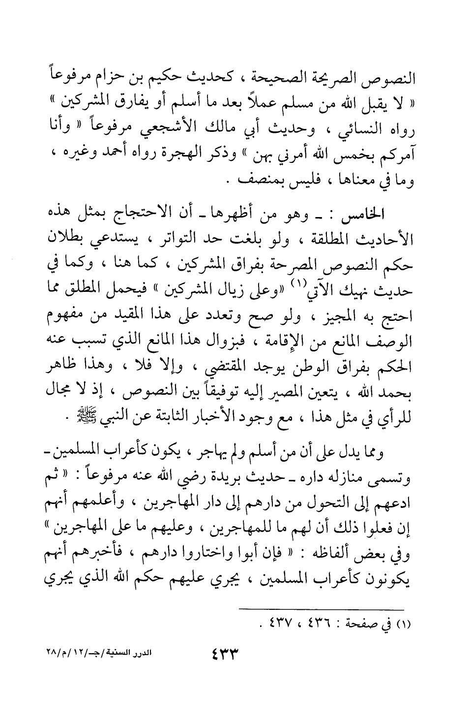 النصوص الصريحة الصحيحة، كحديث حكيم بن حزام مرفوعا: " لا يقبل الله من مسلم عملا بعد ما أسلم، أو يفارق المشركين " 1 رواه النسائي، وحديث أبي مالك الأشجعي مرفوعا: " وأنا آمركم بخمس الله أمرني بهن " 2، وذكر الهجرة رواه أحمد وغيره، وما في معناها، فليس بمنصف.