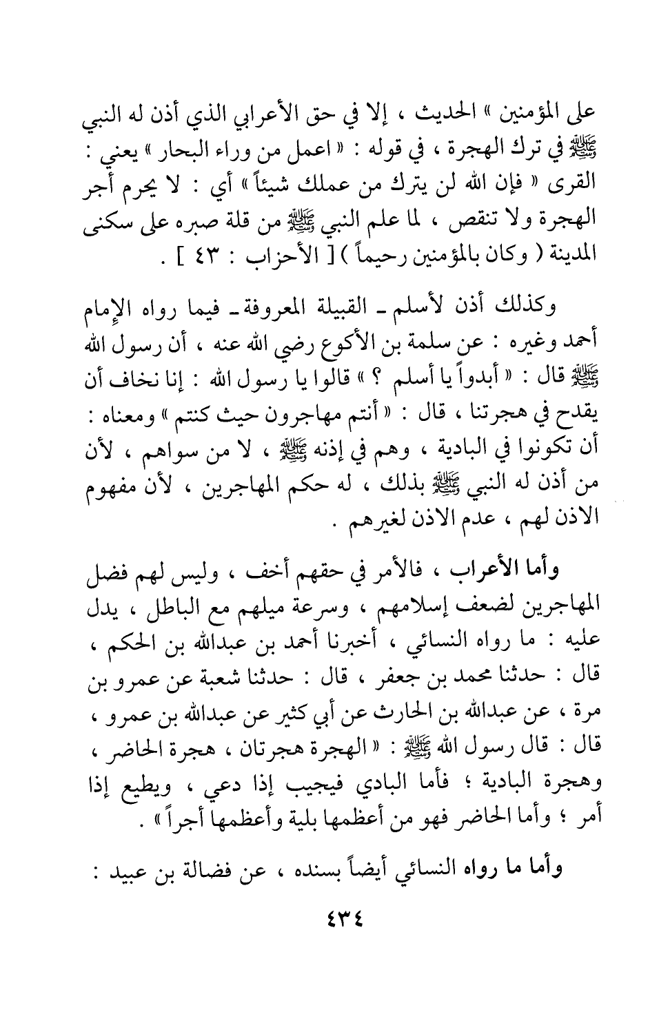 وأما الأعراب، فالأمر في حقهم أخف، وليس لهم فضل المهاجرين لضعف إسلامهم، وسرعة ميلهم مع الباطل، يدل عليه ما رواه النسائي: أخبرنا أحمد بن عبد الله بن الحكم، قال: حدثنا محمد بن جعفر قال: حدثنا شعبة عن عمرو بن مرة عن عبد الله بن الحارث عن أبي كثير عن عبد الله بن عمرو، قال: قال رسول الله صلى الله عليه وسلم:" الهجرة هجرتان: هجرة الحاضر، وهجرة البادية; فأما البادي فيجيب إذا دعي، ويطيع إذا أمر; وأما الحاضر فهو من أعظمها بلية وأعظمها أجرا" 6.