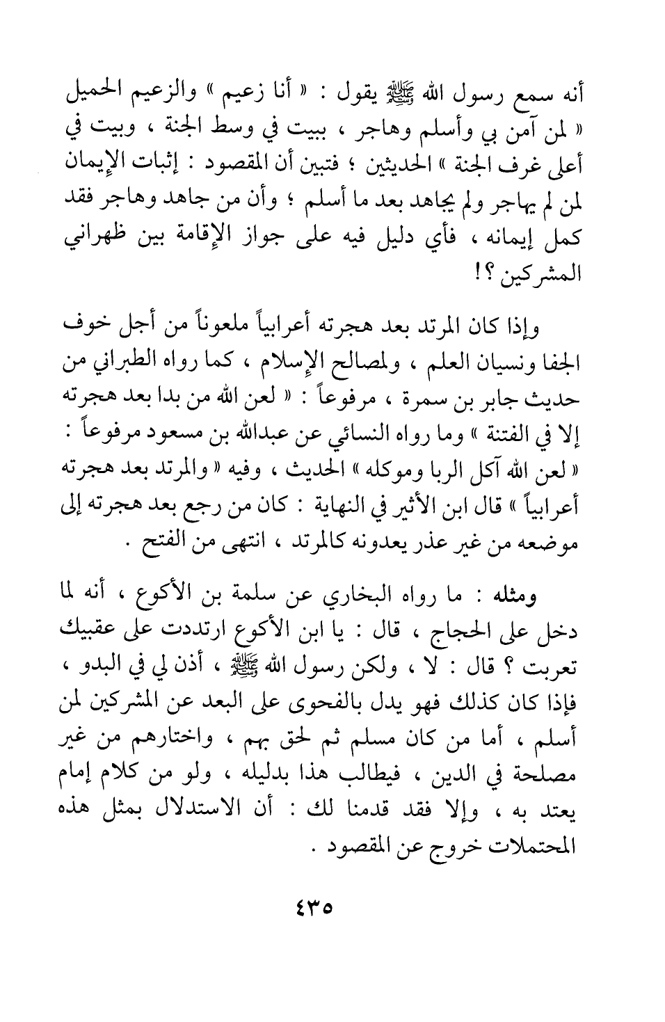 ومثله: ما رواه البخاري عن سلمة بن الأكوع، أنه لما دخل على الحجاج، قال: يا ابن الأكوع ارتددت على عقبيك، تعربت؟ قال: لا، ولكن رسول الله صلى الله عليه وسلم أذن لي في البدو؛ فإذا كان كذلك فهو يدل بالفحوى على البعد عن المشركين لمن أسلم، أما من كان مسلما ثم لحق بهم، واختارهم من غير مصلحة في الدين، فيطالب هذا بدليله، ولو من كلام إمام يعتد به، وإلا فقد قدمنا لك أن الاستدلال بمثل هذه المحتملات خروج عن المقصود.