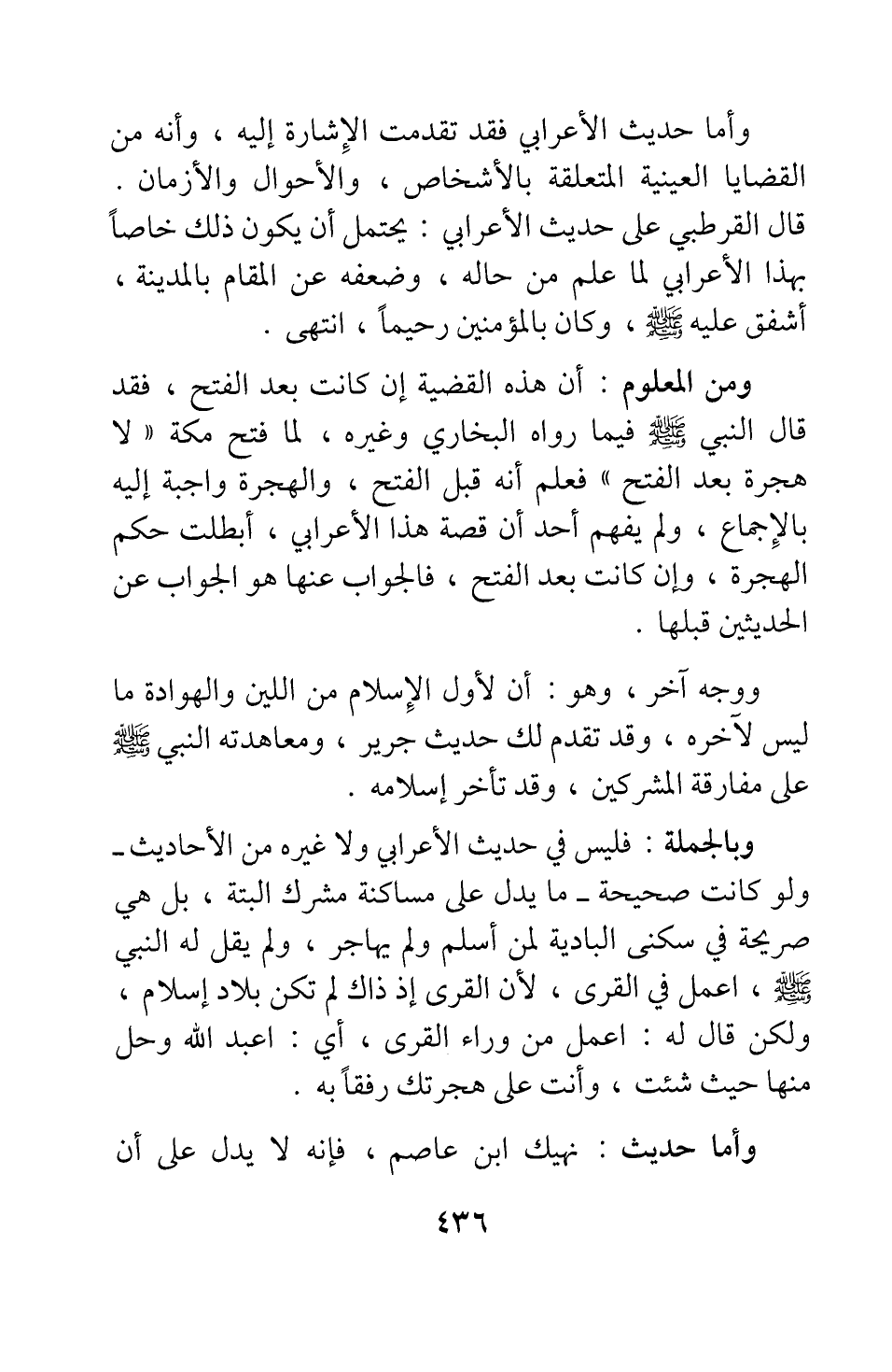 وأما حديث الأعرابي فقد تقدمت الإشارة إليه، وأنه من القضايا العينية المتعلقة بالأشخاص والأحوال والأزمان. قال القرطبي على حديث الأعرابي: يحتمل أن يكون ذلك خاصا بهذا الأعرابي لما علم من حاله، وضعفه عن المقام بالمدينة، أشفق عليه صلى الله عليه وسلم وكان بالمؤمنين رحيما، انتهى.
