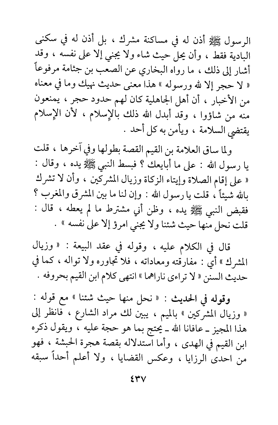 قال في الكلام عليه، وقوله في عقد البيعة: " وزيال المشرك " 3 أي: مفارقته ومعاداته، فلا تجاوره ولا تواله، كما في حديث السنن " لا تراءى ناراهما " 4 انتهى كلام ابن القيم بحروفه.