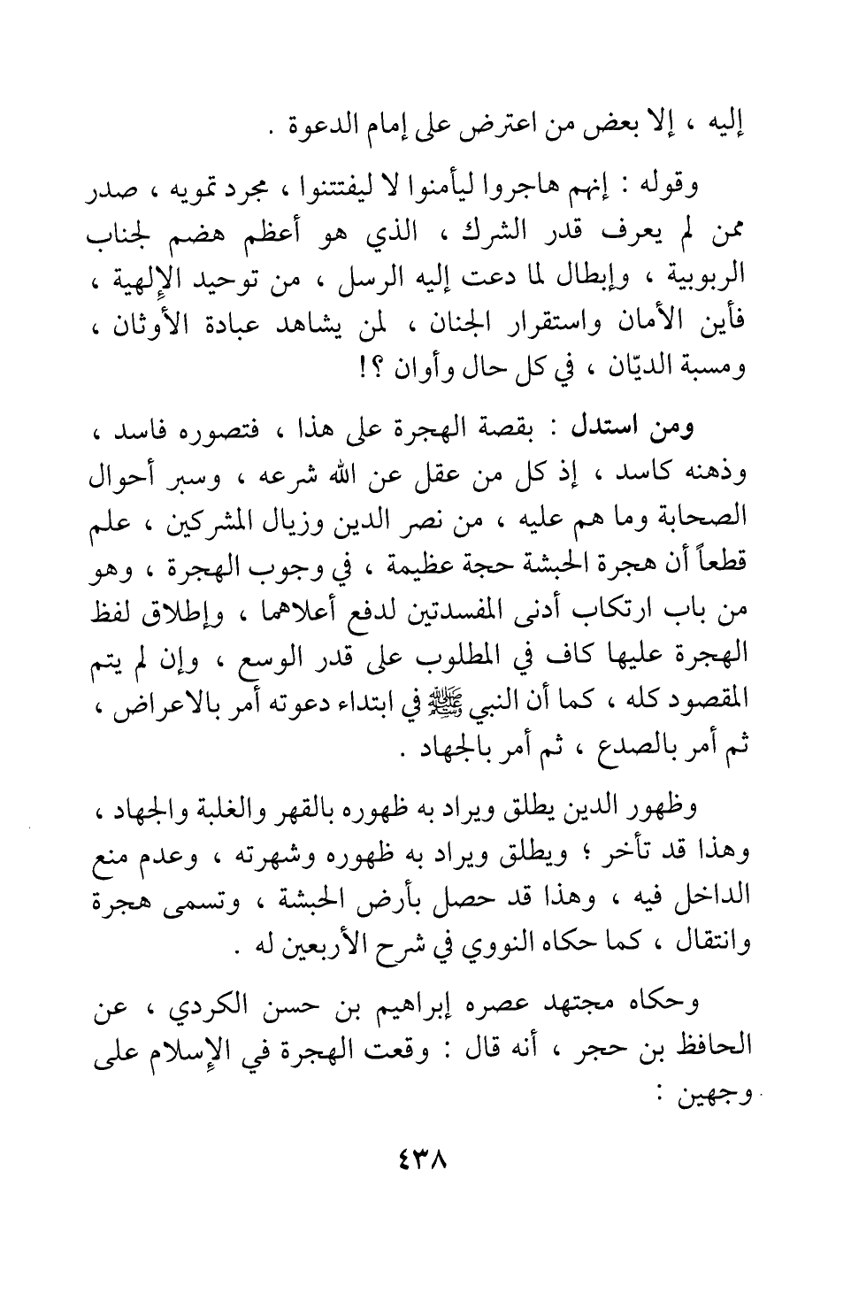 وقوله: إنهم هاجروا ليأمنوا لا ليفتتنوا، مجرد تمويه، صدر ممن لم يعرف قدر الشرك، الذي هو أعظم هضم لجناب الربوبية، وإبطال لما دعت إليه الرسل، من توحيد الإلهية؛ فأين الأمان واستقرار الجنان، لمن يشاهد عبادة الأوثان، ومسبة الديان، في كل حال وأوان؟!