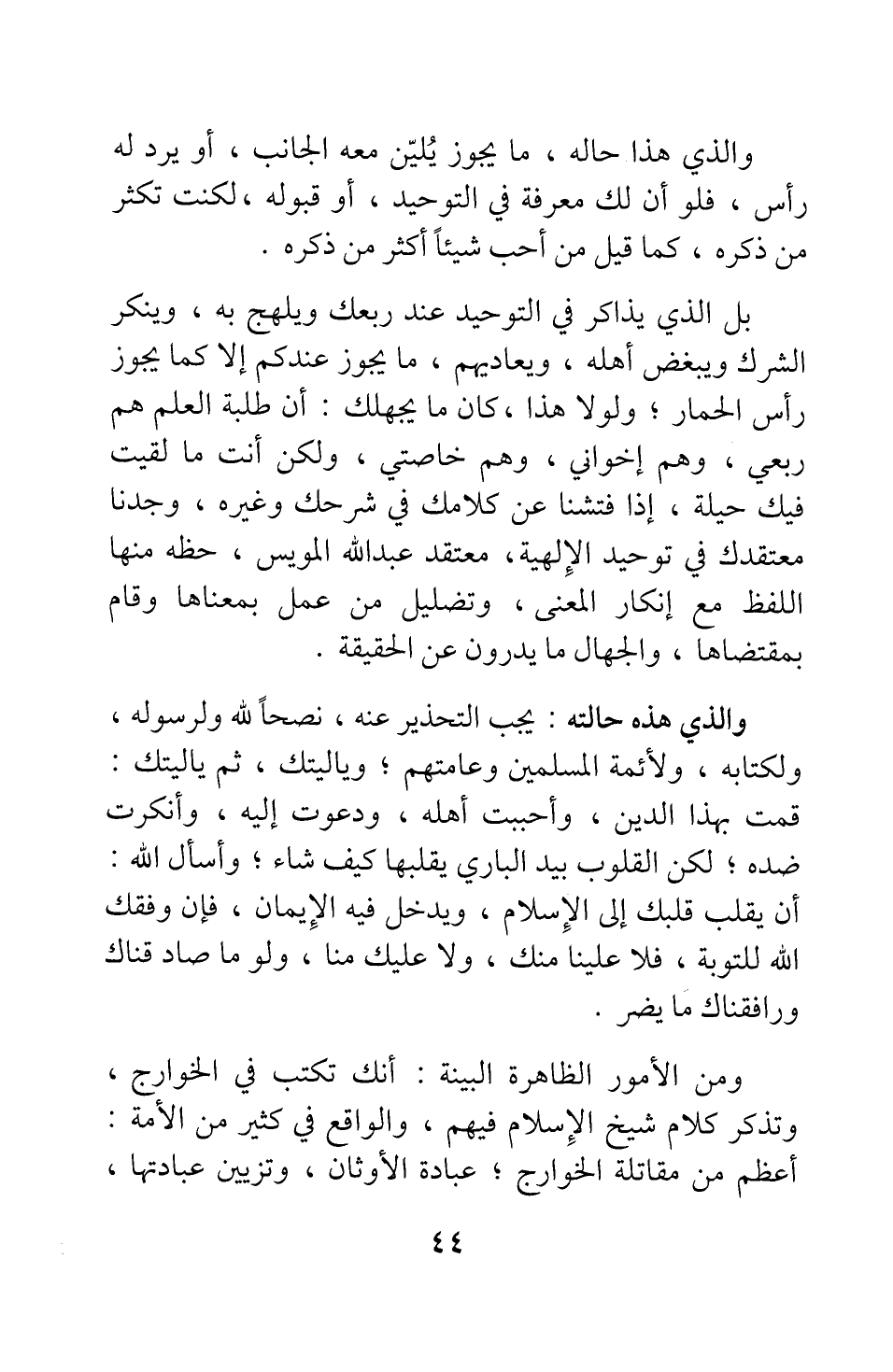 والذي هذا حاله، ما يجوز يلين معه الجانب، أو يرد له رأس؛ فلو أن لك معرفة في التوحيد، أو قبوله، لكنت تكثر من ذكره، كما قيل من أحب شيئا أكثر من ذكره.