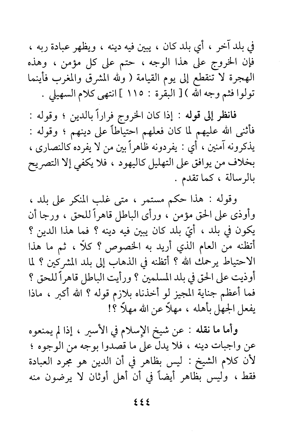 وقوله: هذا حكم مستمر، متى غلب المنكر على بلد، وأوذي على الحق مؤمن، ورأى الباطل قاهرا للحق، ورجا أن يكون في بلد، أي بلد كان يبين فيه دينه؟ فما هذا الدين؟ أتظنه من العام الذي أريد به الخصوص؟ كلا! ثم ما هذا الاحتياط يرحمك الله؟ أتظنه في الذهاب إلى بلد المشركين؟ لما أوذيت على الحق في بلد المسلمين؟ ورأيت الباطل قاهرا للحق؟ فما أعظم جناية المجيز لو أخذناه بلازم قوله؟ الله كبر، ماذا يفعل الجهل بأهله، مهلا عن الله مهلا!
