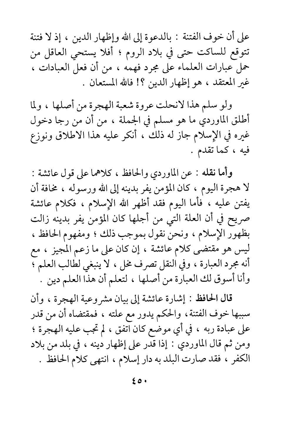 وأما نقله عن الماوردي والحافظ، كلاهما على قول عائشة: (لا هجرة اليوم، كان المؤمن يفر بدينه إلى الله ورسوله، مخافة أن يفتن عليه، فأما اليوم فقد أظهر الله الإسلام) ، فكلام عائشة صريح في أن العلة التي من أجلها كان المؤمن يفر بدينه زالت بظهور الإسلام، ونحن نقول بموجب ذلك; ومفهوم الحافظ ليس هو مقتضى كلام عائشة، إن كان على ما زعم المجيز مع أنه لمجرد العبارة، وفي النقل تصرف مخل، لا ينبغي لطالب العلم; وأنا أسوق لك العبارة من أصلها، لتعلم أن هذا العلم دين.