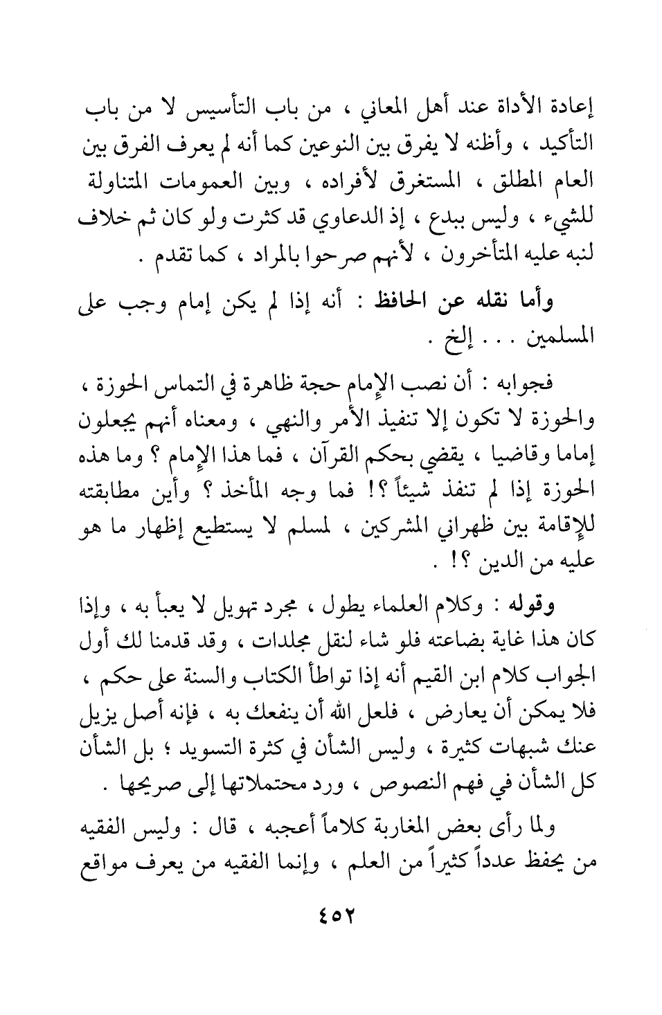 فجوابه: أن نصب الإمام حجة ظاهرة في التماس الحوزة، والحوزة لا تكون إلا تنفيذ الأمر والنهي، ومعناه أنهم يجعلون إماما وقاضيا، يقضي بحكم القرآن، فما هذا الإمام؟ وما هذه الحوزة إذا لم تنفذ شيئا؟! فما وجه المأخذ؟ وأين مطابقته للإقامة بين ظهراني المشركين، لمسلم لا يستطيع إظهار ما هو عليه من الدين؟!.
