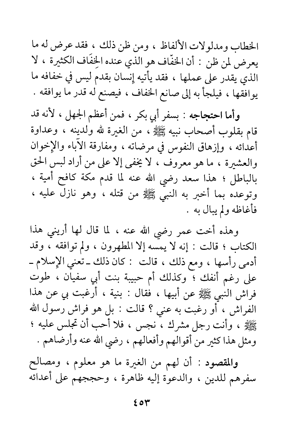 وأما احتجاجه بسفر أبي بكر، فمن أعظم الجهل، لأنه قد قام بقلوب أصحاب نبيه صلى الله عليه وسلم من الغيرة لله ولدينه وعداوة أعدائه، وإزهاق النفوس في مرضاته، ومفارقة الآباء والإخوان والعشيرة، ما هو معروف، لا يخفى إلا على من أراد لبس الحق بالباطل. هذا سعد رضي الله عنه لما قدم مكة كافح أمية، وتوعده بما أخبر به النبي صلى الله عليه وسلم من قتله، وهو نازل عليه، فأغاظه ولم يبال به.
