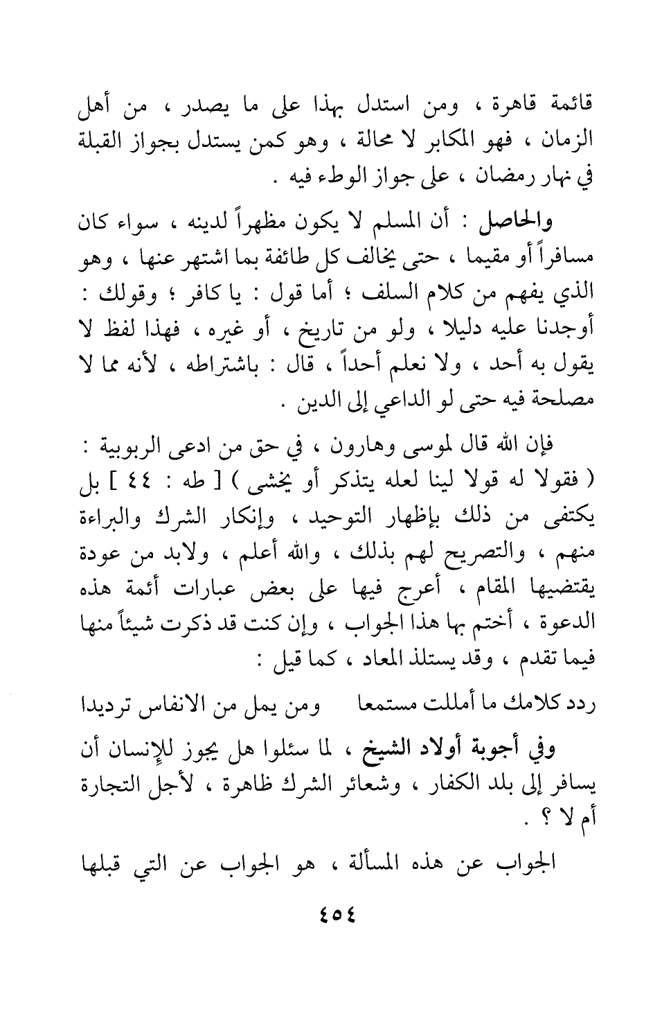 فإن الله قال لموسى وهارون، في حق من ادعى الربوبية: {فَقُولا لَهُ قَوْلاً لَيِّناً لَعَلَّهُ يَتَذَكَّرُ أَوْ يَخْشَى} [سورة طه آية: 44] ، بل يكتفي من ذلك بإظهار التوحيد، وإنكار الشرك والبراءة منهم، والتصريح لهم بذلك؛ والله أعلم. ولا بد من عودة يقتضيها المقام، أعرج فيها على بعض عبارات أئمة هذه الدعوة، أختم بها هذا الجواب، وإن كنت قد ذكرت شيئا منها فيما تقدم، وقد يستلذ المعاد، كما قيل: