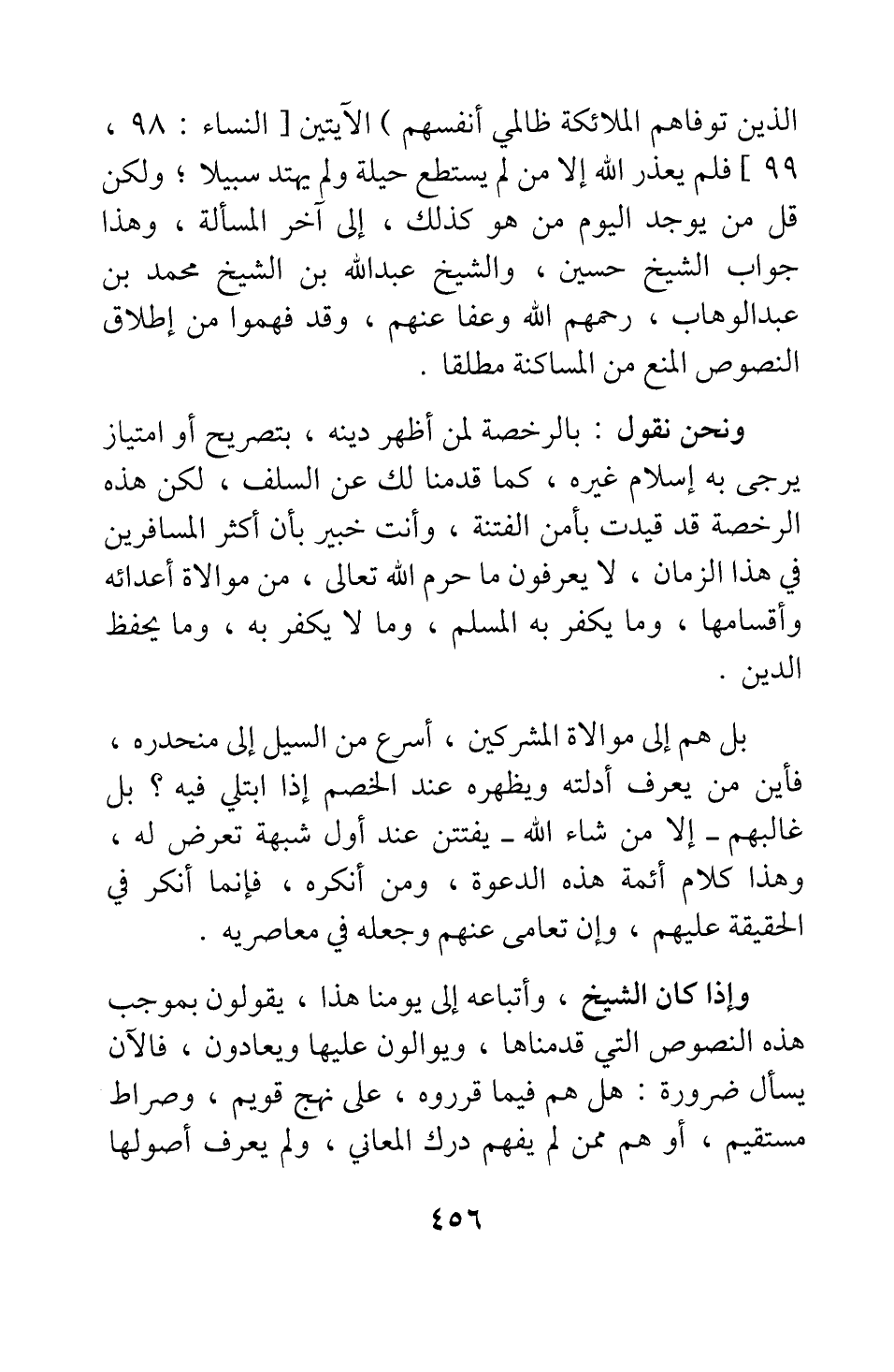 الَّذِينَ تَوَفَّاهُمُ الْمَلائِكَةُ ظَالِمِي أَنْفُسِهِمْ} الآيتين [سورة النساء آية: 97] ، فلم يعذر الله إلا من لم يستطع حيلة ولم يهتد سبيلا; ولكن قل من يوجد اليوم من هو كذلك، إلى آخر المسألة؛ وهذا جواب الشيخ حسين، والشيخ عبد الله بن الشيخ محمد ابن عبد الوهاب، رحمهم الله وعفا عنهم، وقد فهموا من إطلاق النصوص المنع من المساكنة مطلقا.