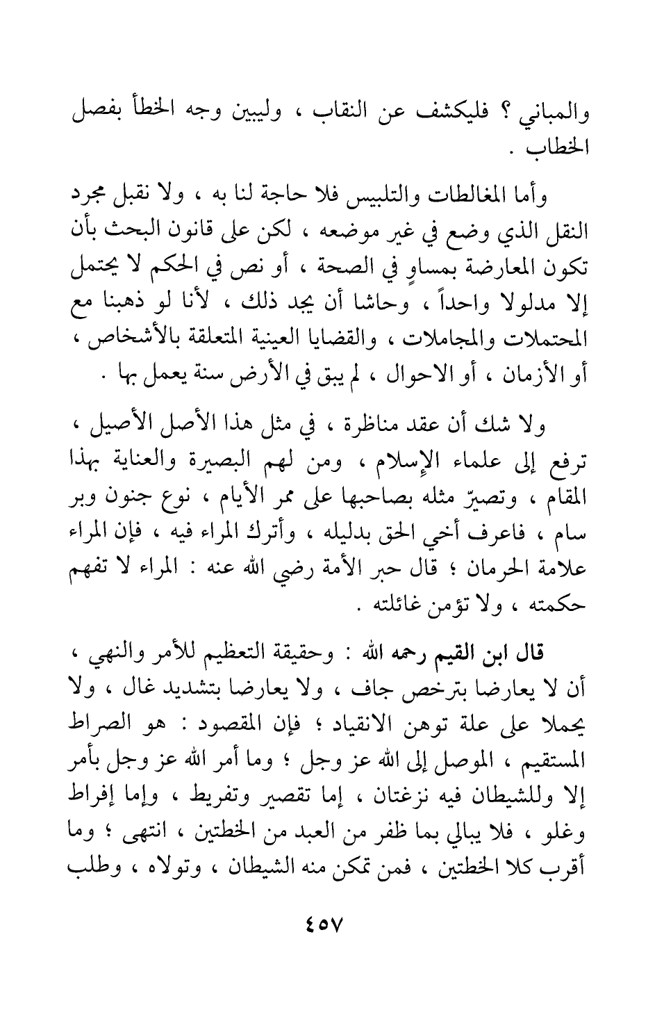 وأما المغالطات والتلبيس فلا حاجة لنا به، ولا نقبل لمجرد النقل الذي وضع في غير موضعه، لكن على قانون البحث بأن تكون المعارضة بمساو في الصحة، أو نص في الحكم لا يحتمل إلا مدلولا واحدا؛ وحاشا أن يجد ذلك، لأنا لو ذهبنا مع المحتملات والمجاملات، والقضايا العينية المتعلقة بالأشخاص، أو الأزمان، أو الأحوال، لم يبق في الأرض سنة يعمل بها.