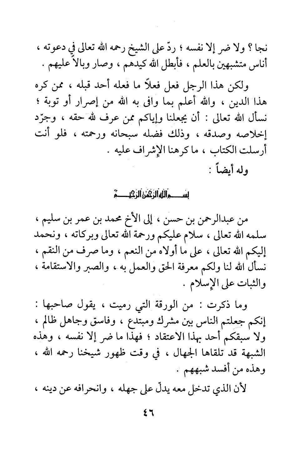 من عبد الرحمن بن حسن، إلى الأخ محمد بن عمر بن سليم، سلمه الله تعالى، سلام عليكم ورحمة الله تعالى وبركاته، ونحمد إليكم الله تعالى، على ما أولاه من النعم، وما صرف من النقم؛ نسأل الله لنا ولكم معرفة الحق والعمل به، والصبر والاستقامة، والثبات على الإسلام.