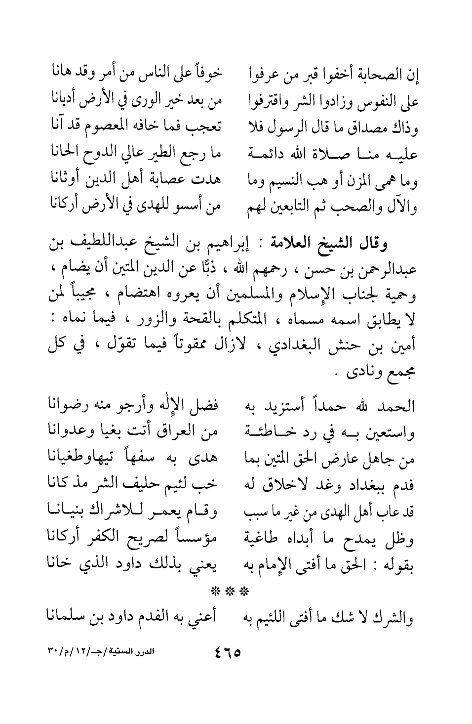 وقال الشيخ العلامة: إبراهيم بن الشيخ عبد اللطيف بن عبد الرحمن بن حسن، رحمهم الله، ذبا عن الدين المتين أن يضام، وحمية لجناب الإسلام والمسلمين أن يعروه اهتضام، مجيبا لمن لا يطابق اسمه مسماه، المتكلم بالقحة والزور، فيما نماه: أمين بن حنش البغدادي، لا زال ممقوتا فيما تقول، في كل مجمع ونادي.