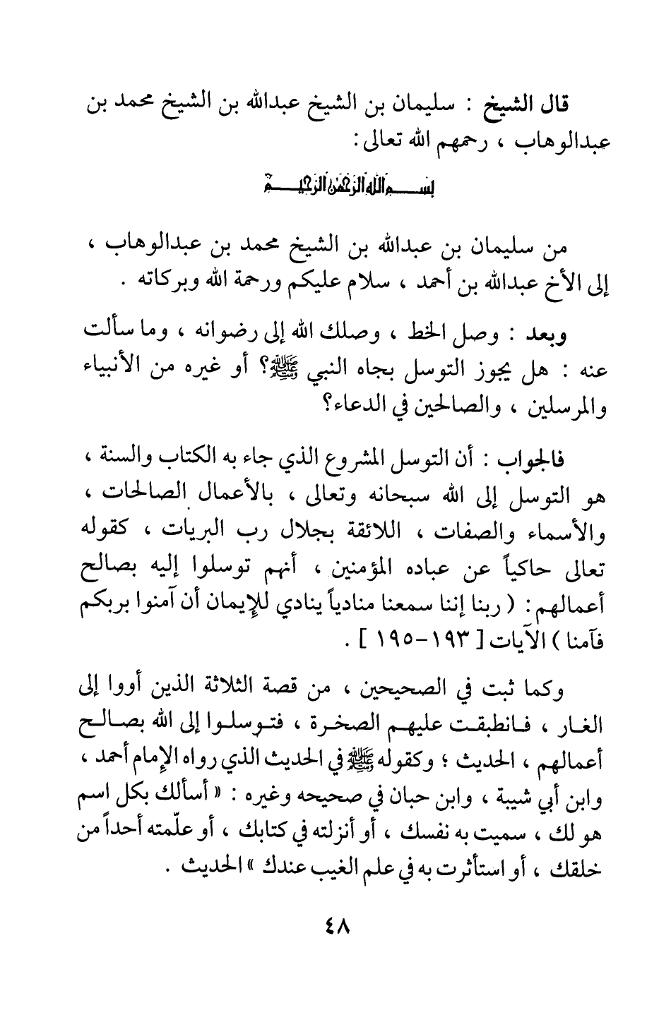 من سليمان بن عبد الله بن الشيخ محمد بن عبد الوهاب، إلى الأخ عبد الله بن أحمد، سلام عليكم ورحمة الله وبركاته.