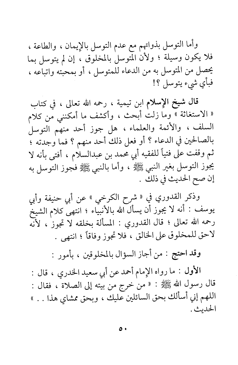 قال شيخ الإسلام ابن تيمية، رحمه الله تعالى، في كتاب "الاستغاثة": وما زلت أبحث، وأكشف ما أمكنني من كلام السلف، والأئمة والعلماء، هل جوز أحد منهم التوسل بالصالحين في الدعاء؟ أو فعل ذلك أحد منهم؟ فما وجدته. ثم وقفت على فتيا للفقيه أبي محمد بن عبد السلام، أفتى بأنه لا يجوز التوسل بغير النبي صلى الله عليه وسلم، وأما بالنبي صلى الله عليه وسلم فجوز التوسل به إن صح الحديث في ذلك.