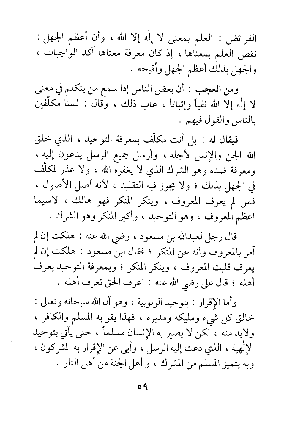 قال رجل لعبد الله بن مسعود رضي الله عنه: هلكت إن لم آمر بالمعروف وأنه عن المنكر; فقال ابن مسعود: "هلكت إن لم يعرف قلبك المعروف، وينكر المنكر"; وبمعرفة التوحيد يعرف أهله; قال علي رضي الله عنه: "اعرف الحق تعرف أهله". ""