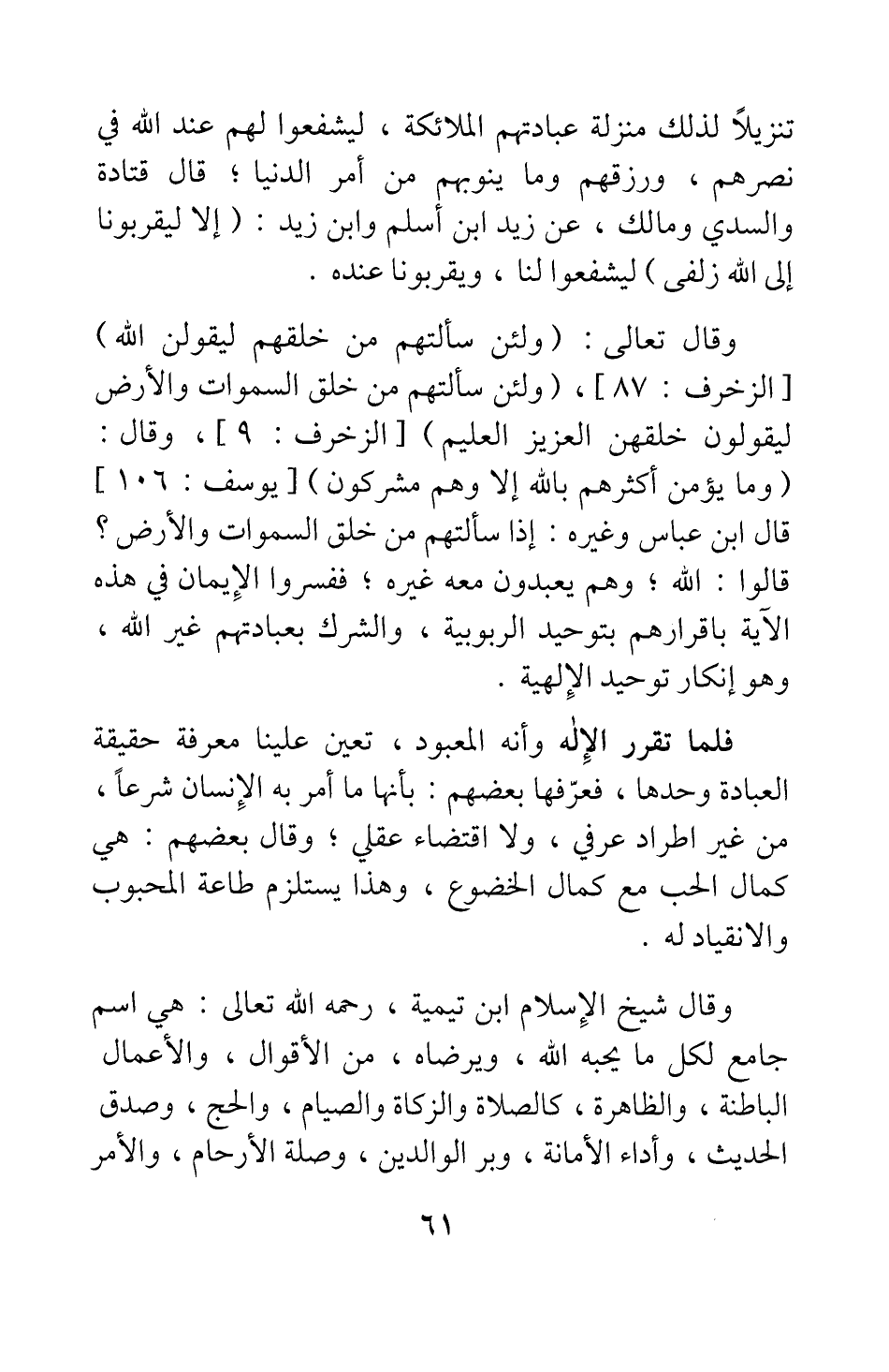 وقال تعالى: {وَلَئِنْ سَأَلْتَهُمْ مَنْ خَلَقَهُمْ لَيَقُولُنَّ اللَّهُ} [سورة الزخرف آية: 87] {وَلَئِنْ سَأَلْتَهُمْ مَنْ خَلَقَ السَّمَاوَاتِ وَالأَرْضَ لَيَقُولُنَّ خَلَقَهُنَّ الْعَزِيزُ الْعَلِيمُ} [سورة الزخرف آية: 9] ، وقال: {وَمَا يُؤْمِنُ أَكْثَرُهُمْ بِاللَّهِ إِلاَّ وَهُمْ مُشْرِكُونَ} [سورة يوسف آية: 106] ، قال ابن عباس وغيره: "إذا سألتهم من خلق السماوات والأرض؟ قالوا: الله; وهم يعبدون معه غيره". ففسروا الإيمان في هذه الآية بإقرارهم بتوحيد الربوبية، والشرك بعبادتهم غير الله، وهو إنكار توحيد الإلهية.