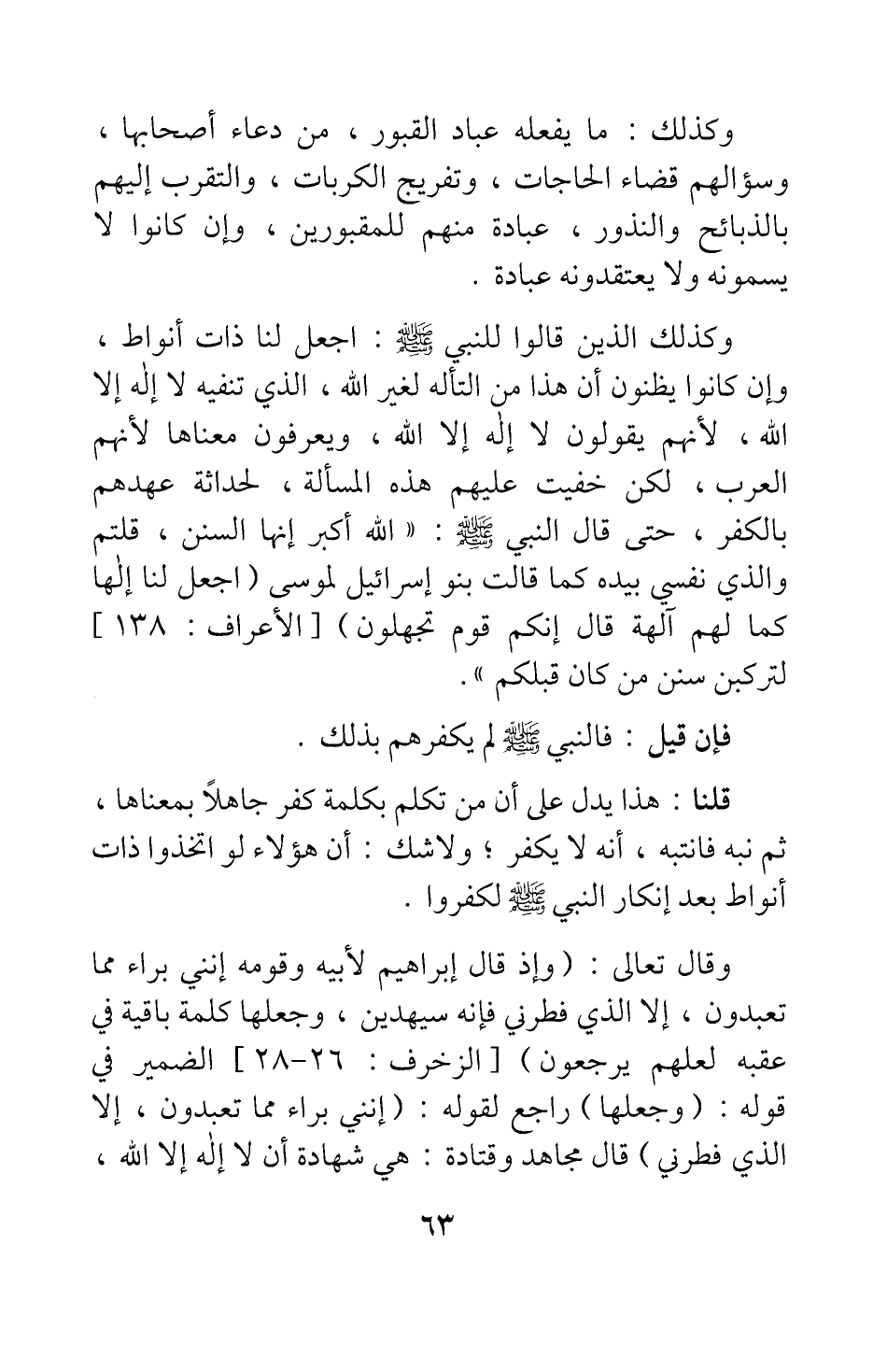 وكذلك الذين قالوا للنبي صلى الله عليه وسلم: اجعل لنا ذات أنواط، وإن كانوا يظنون أن هذا من التأله لغير الله، الذي تنفيه لا إله إلا الله، لأنهم يقولون لا إله إلا الله، ويعرفون معناها لأنهم العرب، لكن خفيت عليهم هذه المسألة، لحداثة عهدهم بالكفر، حتى قال النبي صلى الله عليه وسلم: " الله أكبر إنها السنن، قلتم والذي نفسي بيده كما قالت بنو إسرائيل لموسى: {اجْعَلْ لَنَا إِلَهاً كَمَا لَهُمْ آلِهَةٌ قَالَ إِنَّكُمْ قَوْمٌ تَجْهَلُونَ} 1 لتركبن سنن من كان قبلكم ".