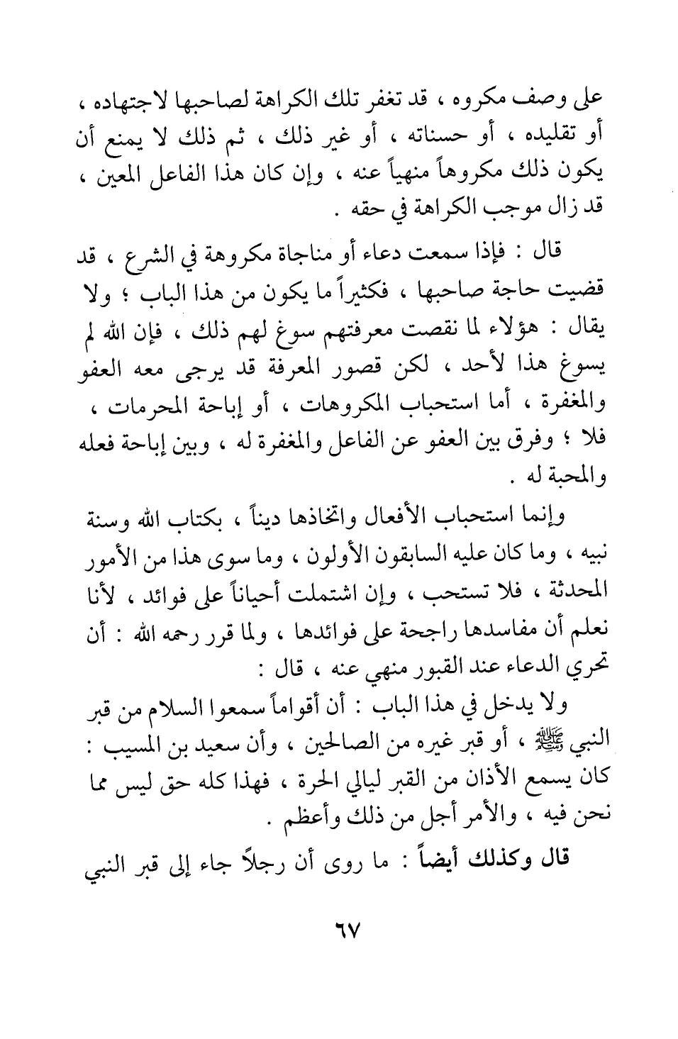 وإنما استحباب الأفعال واتخاذها دينا، بكتاب الله وسنة نبيه، وما كان عليه السابقون الأولون، وما سوى هذا من الأمور المحدثة، فلا تستحب، وإن اشتملت أحيانا على فوائد، لأنا نعلم أن مفاسدها راجحة على فوائدها. ولما قرر رحمه الله: أن تحري الدعاء عند القبور منهي عنه، قال: