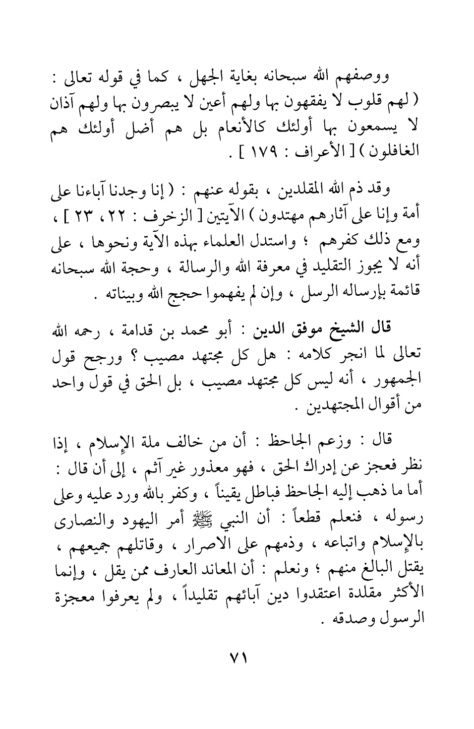 وقد ذم الله المقلدين، بقوله عنهم: {إِنَّا وَجَدْنَا آبَاءَنَا عَلَى أُمَّةٍ وَإِنَّا عَلَى آثَارِهِمْ مُهْتَدُونَ} [سورة الزخرف آية: 22] الآيتين، ومع ذلك كفّرهم; واستدل العلماء بهذه الآية ونحوها، على أنه لا يجوز التقليد في معرفة الله والرسالة، وحجة الله سبحانه قائمة بإرساله الرسل، وإن لم يفهموا حجج الله وبيناته.