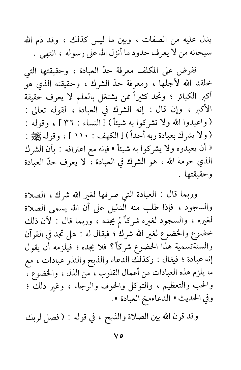ففرض على المكلف معرفة حد العبادة، وحقيقتها التي خلقنا الله لأجلها، ومعرفة حد الشرك، وحقيقته الذي هو أكبر الكبائر; وتجد كثيرا ممن يشتغل بالعلم لا يعرف حقيقة الأكبر، وإن قال: إنه الشرك في العبادة، لقوله تعالى: {وَاعْبُدُوا اللَّهَ وَلا تُشْرِكُوا بِهِ شَيْئاً} [سورة النساء آية: 36] ، وقوله: {وَلا يُشْرِكْ بِعِبَادَةِ رَبِّهِ أَحَداً} [سورة الكهف آية: 110] ، وقوله صلى الله عليه وسلم: "أن يعبدوه ولا يشركوا به شيئا" 1؛ فإنه مع اعترافه بأن الشرك الذي حرمه الله، هو الشرك في العبادة، لا يعرف حد العبادة وحقيقتها.