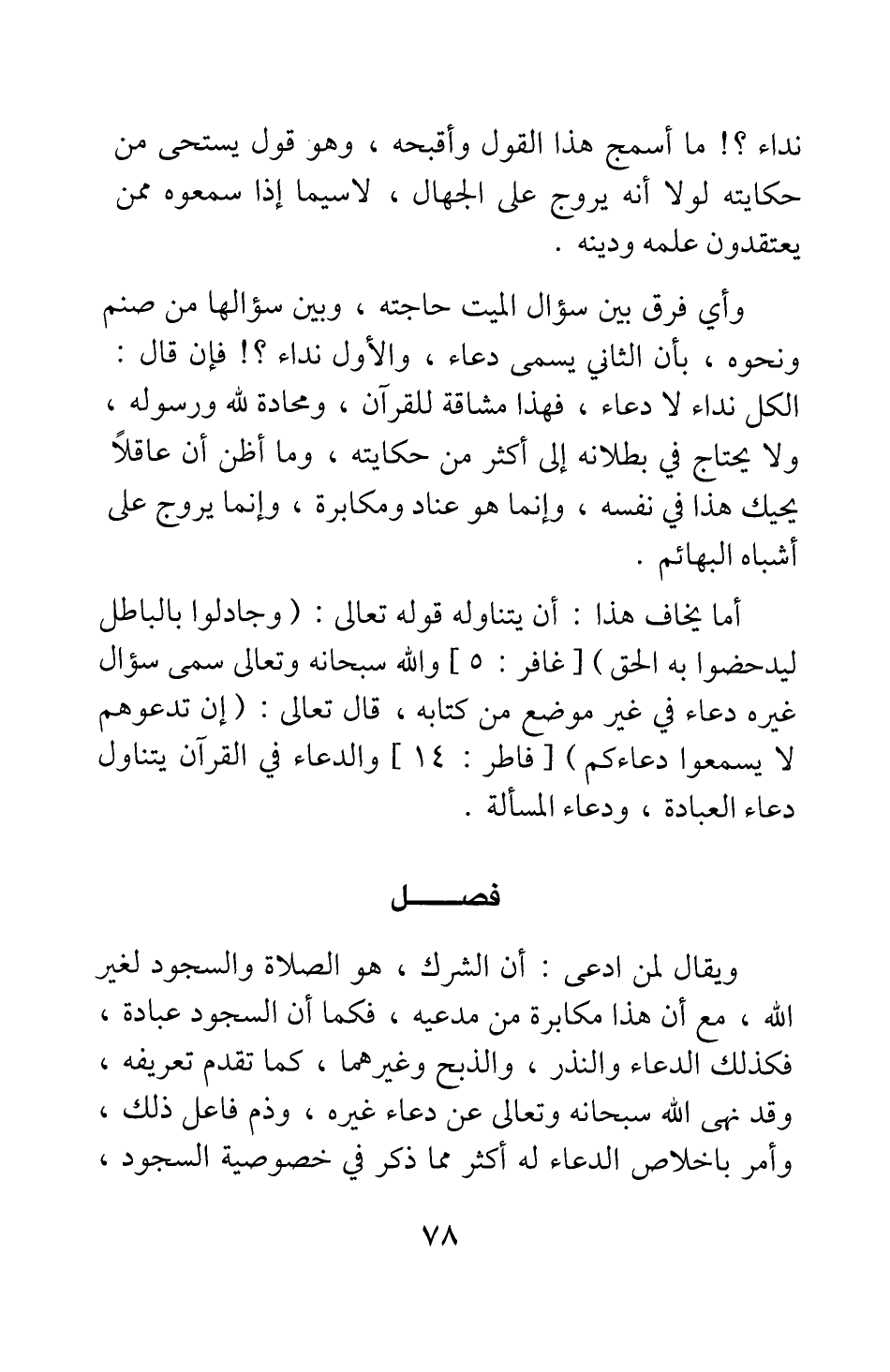 ويقال لمن ادعى أن الشرك هو الصلاة والسجود لغير الله، مع أن هذا مكابرة من مدعيه؛ فكما أن السجود عبادة، فكذلك الدعاء والنذر، والذبح وغيرهما، كما تقدم تعريفه. وقد نهى الله سبحانه وتعالى عن دعاء غيره، وذم فاعل ذلك، وأمر بإخلاص الدعاء له أكثر مما ذكر في خصوصية السجود،