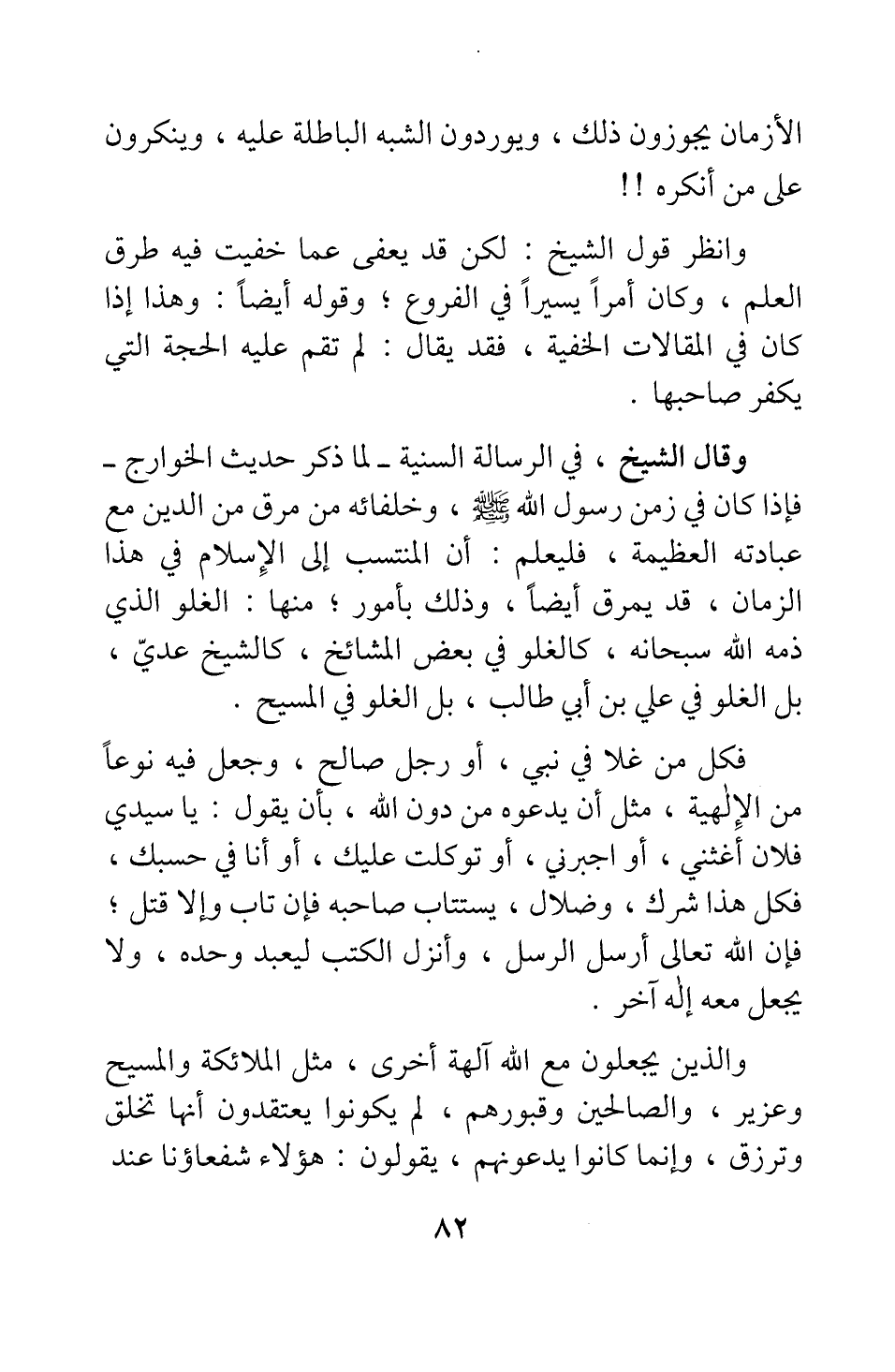 وقال الشيخ، في الرسالة السنية - لما ذكر حديث الخوارج -: فإذا كان في زمن رسول الله صلى الله عليه وسلم وخلفائه من مرق من الدين مع عبادته العظيمة، فليعلم: أن المنتسب إلى الإسلام في هذا الزمان، قد يمرق أيضا، وذلك بأمور: منها: الغلو الذي ذمه الله سبحانه كالغلو في بعض المشائخ، كالشيخ عدي، بل الغلو في علي ابن أبي طالب، بل الغلو في المسيح.