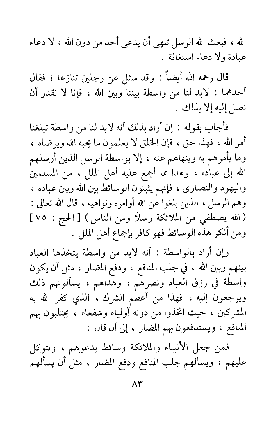 وإن أراد بالواسطة: أنه لا بد من واسطة يتخذها العباد بينهم وبين الله، في جلب المنافع، ودفع المضار، مثل أن يكون واسطة في رزق العباد ونصرهم، وهداهم، يسألونهم ذلك ويرجعون إليه، فهذا من أعظم الشرك، الذي كفر الله به المشركين، حيث اتخذوا من دونه أولياء وشفعاء، يجتلبون بهم المنافع، ويستدفعون بهم المضار، إلى أن قال: