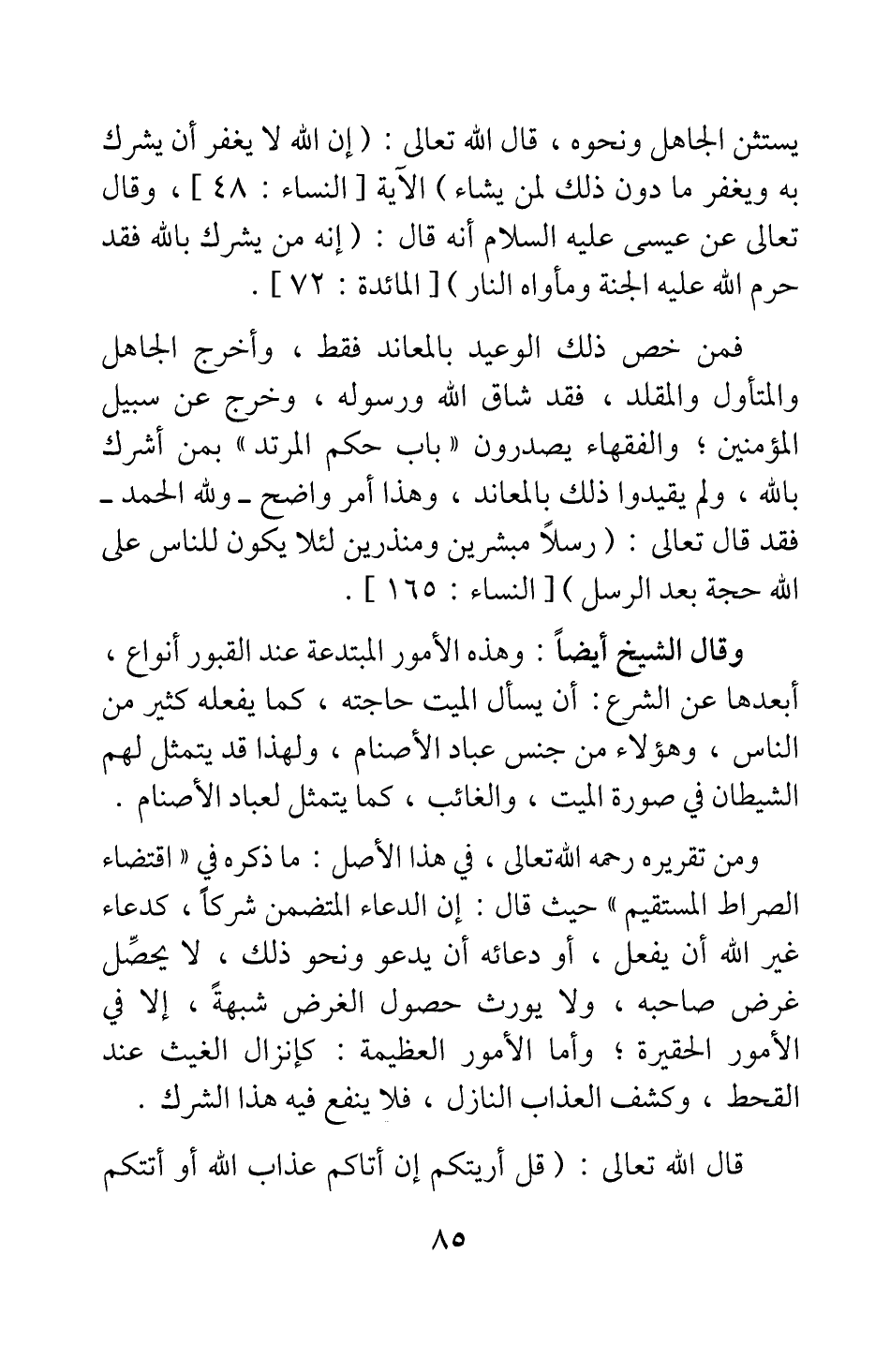 ومن تقريره رحمه الله تعالى، في هذا الأصل: ما ذكره في "اقتضاء الصراط المستقيم" حيث قال: إن الدعاء المتضمن شركا، كدعاء غير الله أن يفعل، أو دعائه أن يدعو ونحو ذلك، لا يحصل غرض صاحبه، ولا يورث حصول الغرض شبهة، إلا في الأمور الحقيرة; وأما الأمور العظيمة: كإنزال الغيث عند القحط، وكشف العذاب النازل، فلا ينفع فيه هذا الشرك.
