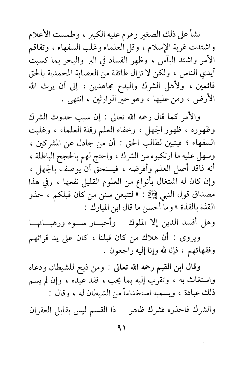 والأمر كما قال رحمه الله تعالى: إن سبب حدوث الشرك وظهوره: ظهور الجهل، وخفاء العلم وقلة العلماء، وغلبت السفهاء; فيتبين لطالب الحق أن من جادل عن المشركين، وسهل عليه ما ارتكبوه من الشرك، واحتج لهم بالحجج الباطلة، أنه فاقد أصل العلم وأفرضه، فيستحق أن يوصف بالجهل، وإن كان له اشتغال بأنواع من العلوم القليل نفعها، وفي هذا مصداق قول النبي صلى الله عليه وسلم: " لتتبعن سنن من كان قبلكم، حذو القذة بالقذة "1. وما أحسن ما قال ابن المبارك: