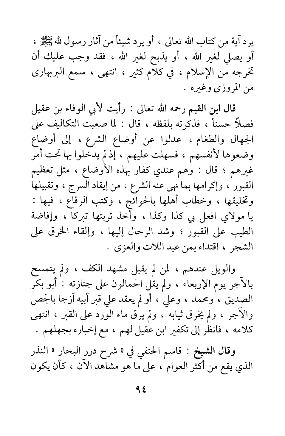 والويل عندهم، لمن لم يقبل مشهد الكف، ولم يتمسح بالآجر يوم الأربعاء، ولم يقل الحمالون على جنازته: أبو بكر الصديق، ومحمد، وعلي، أو لم يعقد علي قبر أبيه آزجا بالجص والآجر، ولم يخرق ثيابه، ولم يرق ماء الورد على القبر، انتهى كلامه. فانظر إلى تكفير ابن عقيل لهم، مع إخباره بجهلهم.