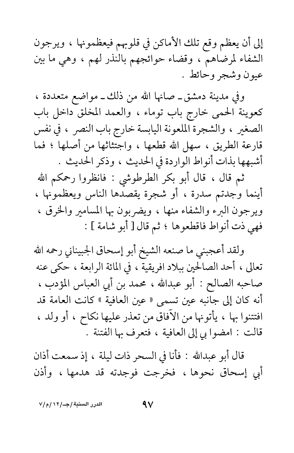 وفي مدينة دمشق - صانها الله من ذلك - مواضع متعددة، كعوينة الحمى خارج باب توما، والعمد المخلق داخل باب الصغير، والشجرة الملعونة اليابسة خارج باب النصر، في نفس قارعة الطريق، سهل الله قطعها، واجتثاثها من أصلها; فما أشبهها بذات أنواط الواردة في الحديث، وذكر الحديث.