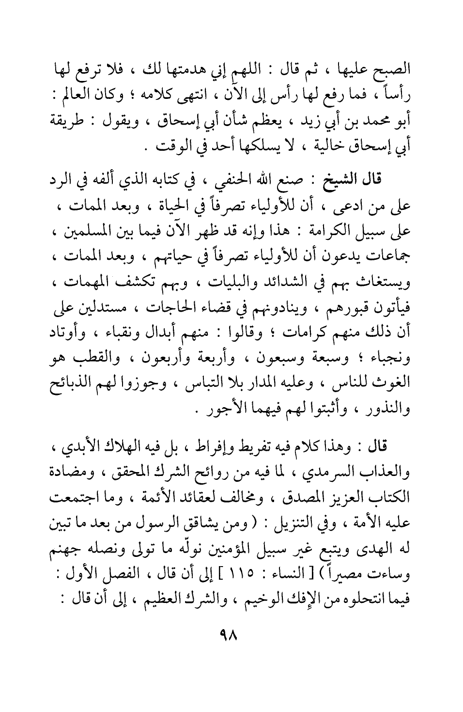 قال: وهذا كلام فيه تفريط وإفراط، بل فيه الهلاك الأبدي، والعذاب السرمدي، لما فيه من روائح الشرك المحقق، ومضادة الكتاب العزيز المصدق، ومخالف لعقائد الأئمة، وما اجتمعت عليه الأمة، وفي التنْزيل: {وَمَنْ يُشَاقِقِ الرَّسُولَ مِنْ بَعْدِ مَا تَبَيَّنَ لَهُ الْهُدَى وَيَتَّبِعْ غَيْرَ سَبِيلِ الْمُؤْمِنِينَ نُوَلِّهِ مَا تَوَلَّى وَنُصْلِهِ جَهَنَّمَ وَسَاءَتْ مَصِيراً} [سورة النساء آية: 115] إلى أن قال: الفصل الأول: فيما انتحلوه من الإفك الوخيم، والشرك العظيم، إلى أن قال: