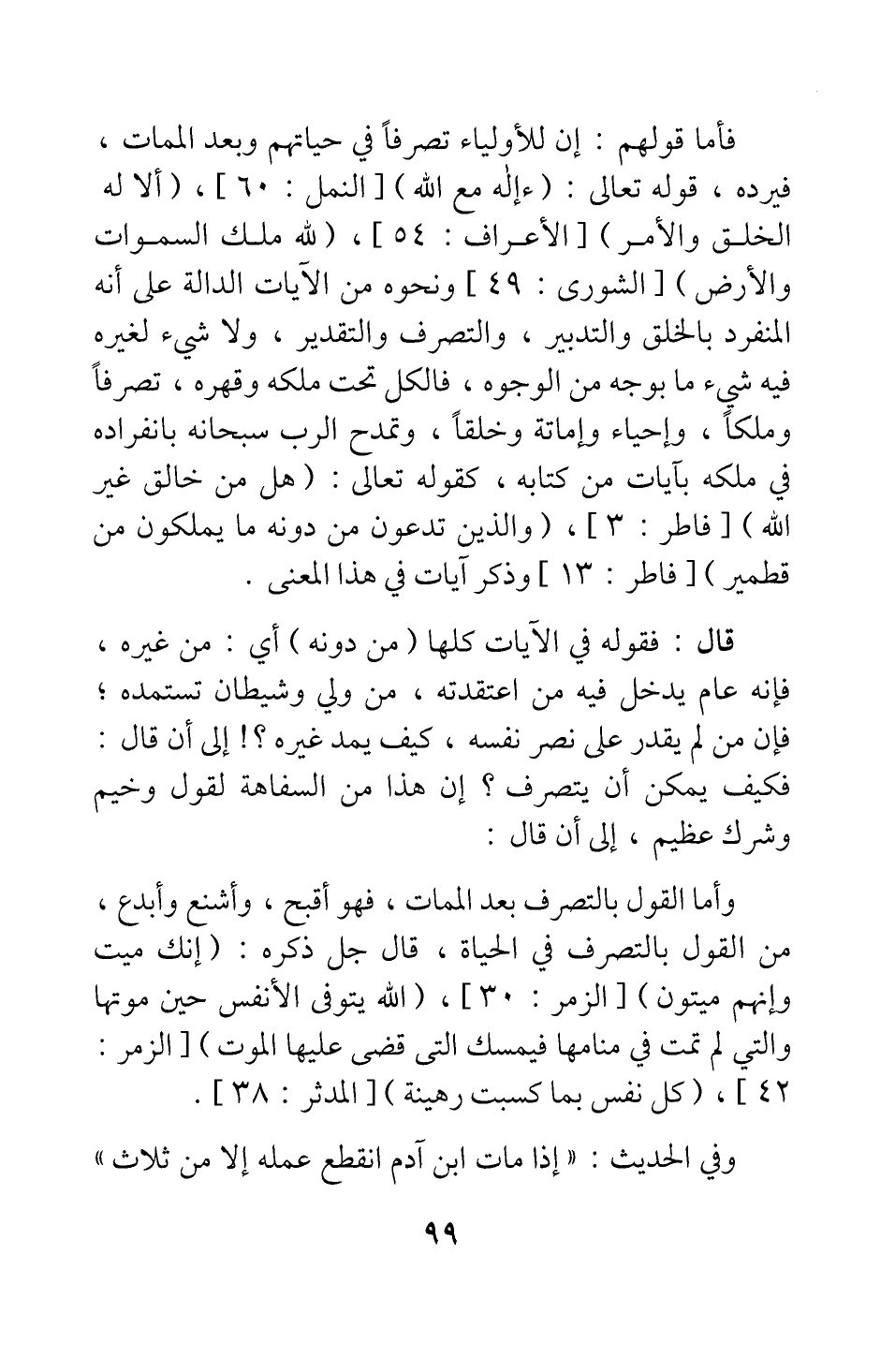 وأما القول بالتصرف بعد الممات، فهو أقبح، وأشنع وأبدع، من القول بالتصرف في الحياة، قال جل ذكره: {إِنَّكَ مَيِّتٌ وَإِنَّهُمْ مَيِّتُونَ} [سورة الزمر آية: 30] {اللَّهُ يَتَوَفَّى الأَنْفُسَ حِينَ مَوْتِهَا وَالَّتِي لَمْ تَمُتْ فِي مَنَامِهَا فَيُمْسِكُ الَّتِي قَضَى عَلَيْهَا الْمَوْتَ} [سورة الزمر آية: 42] ، {كُلُّ نَفْسٍ بِمَا كَسَبَتْ رَهِينَةٌ} [سورة المدثر آية: 38] .