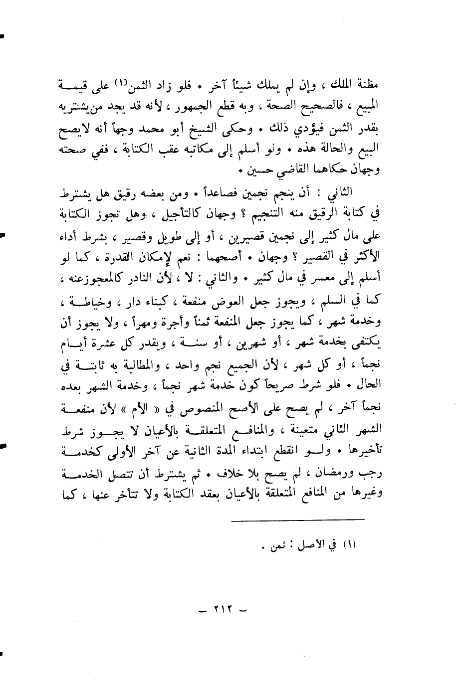 الثَّانِي: أَنْ يُنَجِّمَ نَجْمَيْنِ فَصَاعِدًا. وَمَنْ بَعْضُهُ رَقِيقٌ هَلْ يُشْتَرَطُ فِي كِتَابَةِ الرَّقِيقِ مِنْهُ التَّنْجِيمُ؟ وَجْهَانِ كَالتَّأْجِيلِ، وَهَلْ تَجُوزُ الْكِتَابَةُ عَلَى مَالٍ كَثِيرٍ إِلَى نَجْمَيْنِ قَصِيرَيْنِ، أَوْ إِلَى طَوِيلٍ وَقَصِيرٍ، بِشَرْطِ أَدَاءِ الْأَكْثَرِ فِي الْقَصِيرِ؟ وَجْهَانِ. أَصَحُّهُمَا: نَعَمْ لِإِمْكَانِ الْقُدْرَةِ، كَمَا لَوْ أَسْلَمَ إِلَى مُعْسِرٍ فِي مَالٍ كَثِيرٍ. وَالثَّانِي: لَا ; لِأَنَّ النَّادِرَ كَالْمَعْجُوزِ عَنْهُ، كَمَا فِي السَّلَمِ، وَيَجُوزُ جَعْلُ الْعِوَضِ مَنْفَعَةً، كَبِنَاءِ دَارٍ، وَخِيَاطَةٍ، وَخِدْمَةِ شَهْرٍ، كَمَا يَجُوزُ جَعْلُ الْمَنْفَعَةِ ثَمَنًا وَأُجْرَةً وَمَهْرًا، وَلَا يَجُوزُ أَنْ يَكْتَفِيَ بِخِدْمَةِ شَهْرٍ، أَوْ شَهْرَيْنِ، أَوْ سَنَةٍ، وَيُقَدِّرُ كُلَّ عَشَرَةِ أَيَّامٍ نَجْمًا، أَوْ كُلَّ شَهْرٍ ; لِأَنَّ الْجَمِيعَ نَجْمٌ وَاحِدٌ، وَالْمُطَالَبَةُ بِهِ ثَابِتَةٌ فِي الْحَالِ. فَلَوْ شَرَطَ صَرِيحًا كَوْنَ خِدْمَةِ شَهْرٍ نَجْمًا، وَخِدْمَةُ الشَّهْرِ بَعْدَهُ نَجْمًا آخَرَ، لَمْ يَصِحَّ عَلَى الْأَصَحِّ الْمَنْصُوصِ فِي الْأُمِّ لِأَنَّ مَنْفَعَةَ الشَّهْرِ الثَّانِي مُتَعَيِّنَةٌ، وَالْمَنَافِعُ الْمُتَعَلِّقَةُ بِالْأَعْيَانِ لَا يَجُوزُ شَرْطُ تَأْخِيرِهَا. وَلَوِ انْقَطَعَ ابْتِدَاءُ الْمُدَّةِ الثَّانِيَةِ عَنْ آخِرِ الْأُولَى كَخِدْمَةِ رَجَبٍ وَرَمَضَانَ، لَمْ يَصِحَّ بِلَا خِلَافٍ.
