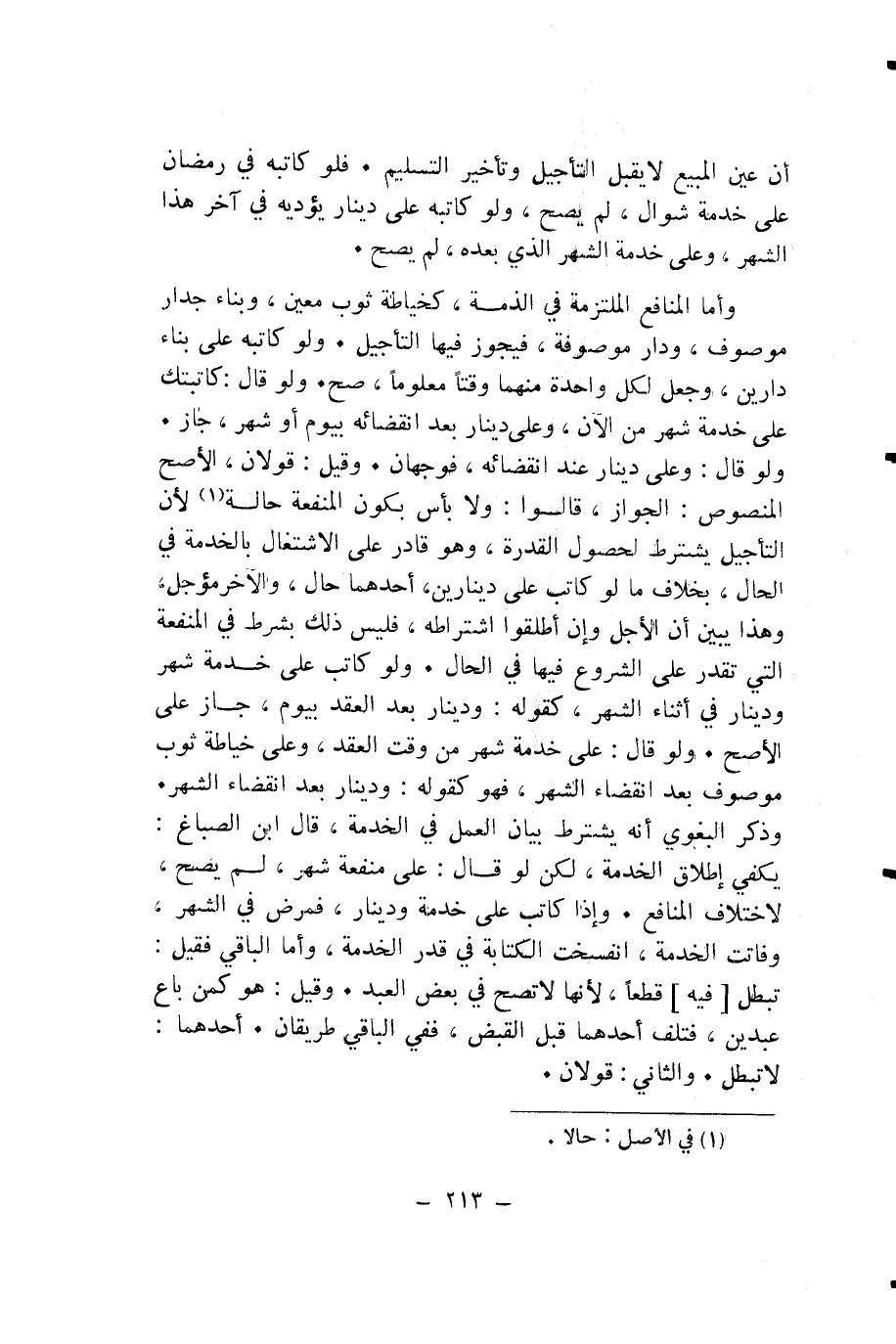 وَأَمَّا الْمَنَافِعُ الْمُلْتَزَمَةُ فِي الذِّمَّةِ، كَخِيَاطَةِ ثَوْبٍ مُعَيَّنٍ، وَبِنَاءِ جِدَارٍ مَوْصُوفٍ، وَدَارٍ مَوْصُوفَةٍ، فَيَجُوزُ فِيهَا التَّأْجِيلُ. وَلَوْ كَاتَبَهُ عَلَى بِنَاءِ دَارَيْنِ، وَجَعَلَ لِكُلِّ وَاحِدَةٍ مِنْهُمَا وَقْتًا مَعْلُومًا، صَحَّ. وَلَوْ قَالَ: كَاتَبْتُكَ عَلَى خِدْمَةِ شَهْرٍ مِنَ الْآنِ، وَعَلَى دِينَارٍ بَعْدَ انْقِضَائِهِ بِيَوْمٍ أَوْ شَهْرٍ، جَازَ. وَلَوْ قَالَ: وَعَلَى دِينَارٍ عِنْدَ انْقِضَائِهِ، فَوَجْهَانِ. وَقِيلَ: قَوْلَانِ، الْأَصَحُّ الْمَنْصُوصُ: الْجَوَازُ، قَالُوا: وَلَا بَأْسَ بِكَوْنِ الْمَنْفَعَةِ حَالَّةً لِأَنَّ التَّأْجِيلَ يُشْتَرَطُ لِحُصُولِ الْقُدْرَةِ، وَهُوَ قَادِرٌ عَلَى الِاشْتِغَالِ بِالْخِدْمَةِ فِي الْحَالِ، بِخِلَافِ مَا لَوْ كَاتَبَ عَلَى دِينَارَيْنِ، أَحَدُهُمَا حَالٌّ، وَالْآخَرُ مُؤَجَّلٌ، وَهَذَا يُبَيِّنُ أَنَّ الْأَجَلَ وَإِنْ أَطْلَقُوا اشْتِرَاطَهُ، فَلَيْسَ ذَلِكَ بِشَرْطٍ فِي الْمَنْفَعَةِ الَّتِي تُقَدَّرُ عَلَى الشُّرُوعِ فِيهَا فِي الْحَالِ. وَلَوْ كَاتَبَ عَلَى خِدْمَةِ شَهْرٍ وَدِينَارٍ فِي أَثْنَاءِ الشَّهْرِ، كَقَوْلِهِ: وَدِينَارٍ بَعْدَ الْعَقْدِ بِيَوْمٍ، جَازَ عَلَى الْأَصَحِّ.